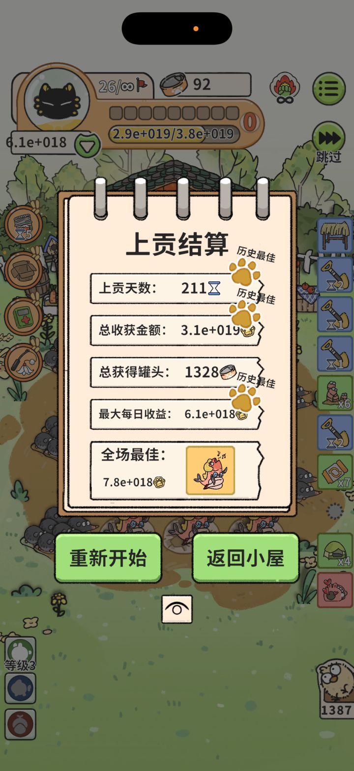 先上图,点到不想点了,罐头算是10万溢出的,pc端同样阵容拿过1100+天还没到达极限#开局玩具>必选:逗猫棒+纸箱子(拿化石扫描仪<获得化石数量x2>+垂耳兔)次选:伊丽莎白圈,电动摇杆(我超级喜欢配合这两个)角色:大骰(5阶段转克鲁克山)局面:必须要场上有迅猛龙(可以的话用大骰技能给它刷一下获得化石数量)#初期场上迅猛龙<3只时优先选择迅猛龙,>3时选择小盗龙,当场上小盗龙持有