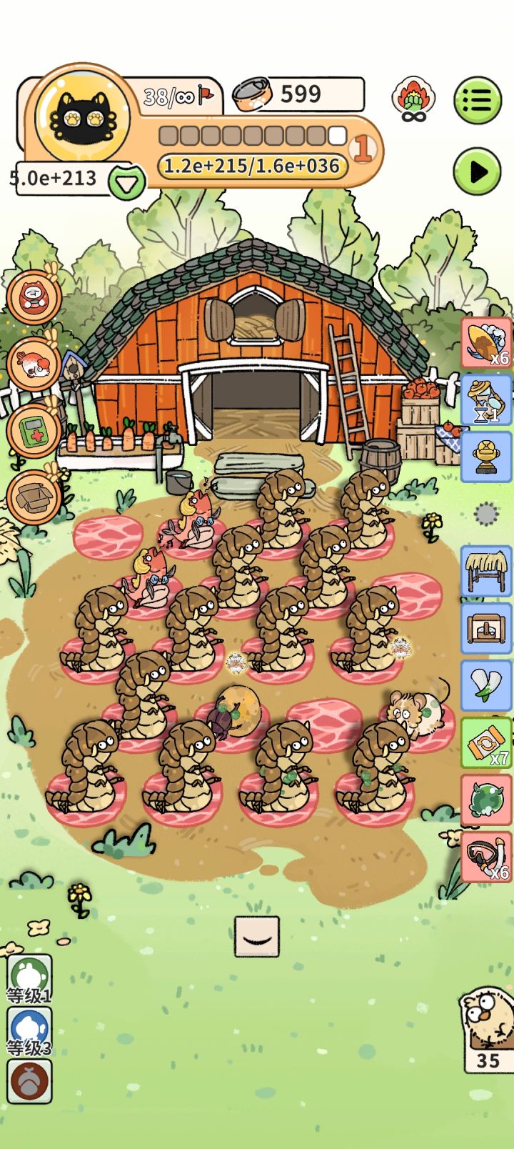 花枝鼠一个已经1000M上限了,每轮获得的钱已经远大于要求了,新动物就找一找能繁殖老鼠的,有帐篷繁殖的新的也是1000M,无限挂机就好了,真爽。