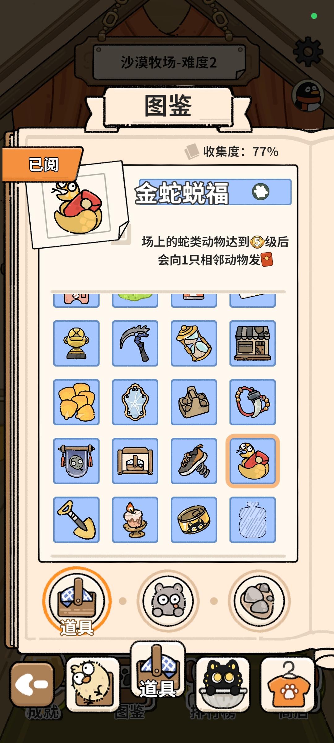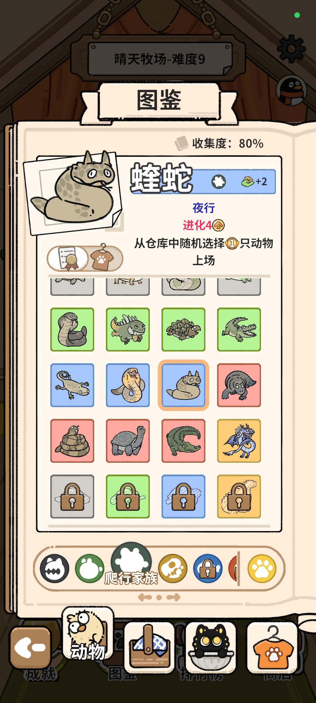 沙漠牧场(不论难度100%过) 随便玩,先叠“眼镜蛇”,同时一定要先多刷商店买下“异常糖果”,之后随便玩, 期间攒“蝰蛇”,有就选,4~5条就行,这个利于夜间还能刷一轮金币。(动物夜间爆一轮金币,白天爆一轮金币) 刷到3/4自然容易出“湾鳄”或者“猫头鹰”,至少有一条“湾鳄”或者“猫头鹰”清场,期间“眼镜蛇”叠着不要停,“湾鳄”只是用来清场给“应龙”和“眼镜蛇”腾位置的,不用太多,2~3条就