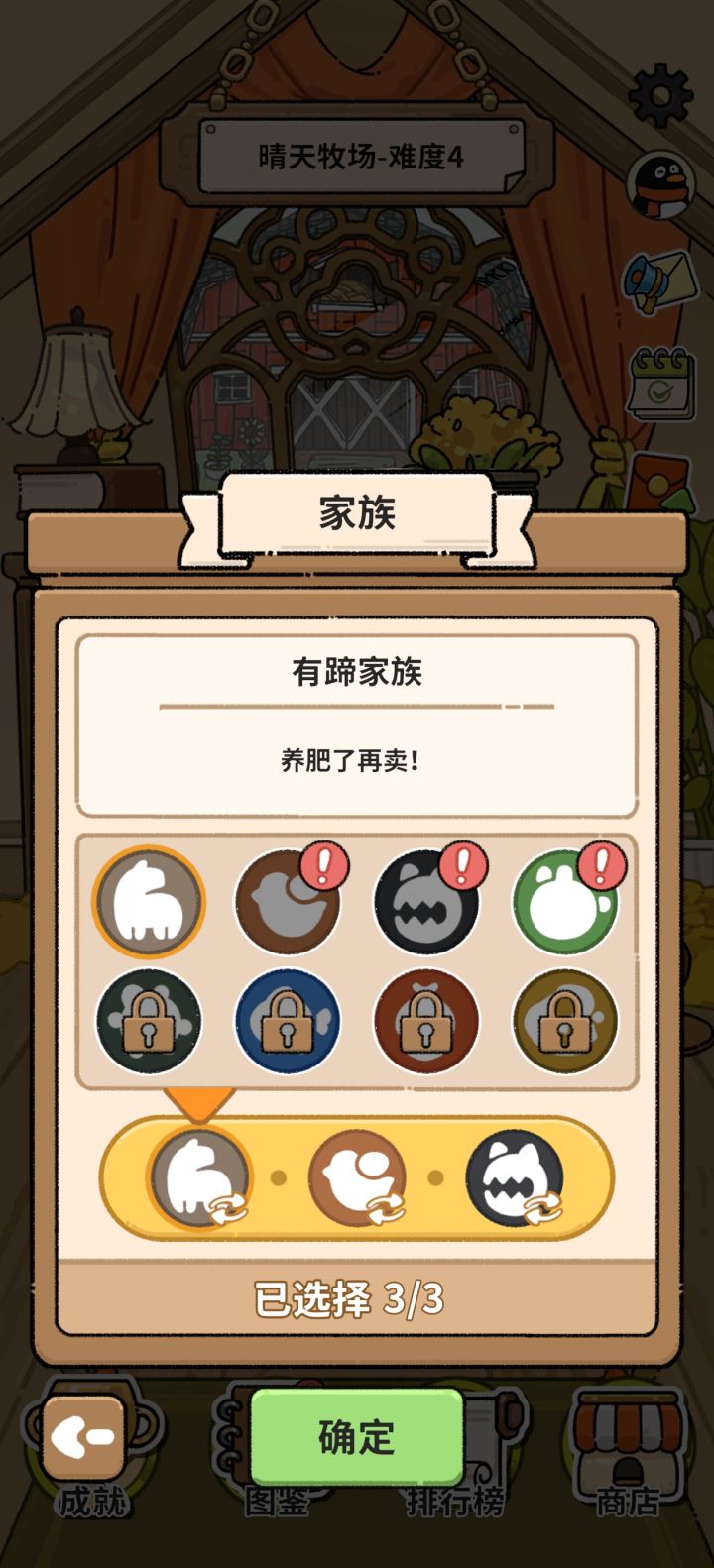 晴天牧场(不论难度100%过) 【核心:前中期“老虎”“鹰”→后期“剑齿虎”+“恐怖鸟”+“巢穴”产蛋】 1~3多选“马”,爆金快,攒一下“有蹄动物” 少选鸟。 [鸟多了占位置,前期不好用“老虎”吃“有蹄动物”赚钱过关,“老虎”啥都吃且来钱快,等“食肉动物”天赋三级还可以吃“食肉动物”,吃得多赚钱快。] (“百灵鸟”也不需要,“百灵鸟”在游戏里增加不了什么概率,打到7/8时自然很容易出红