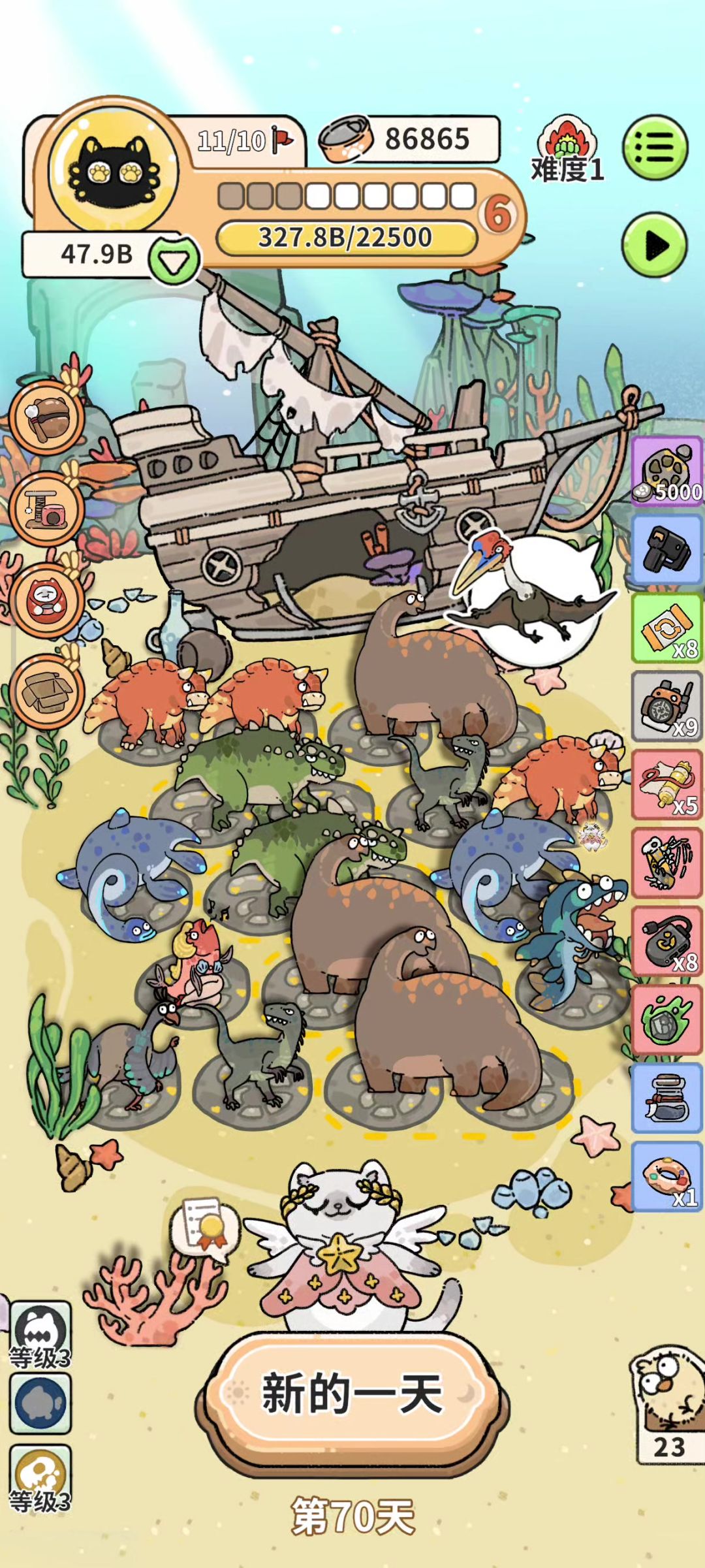 如视频 太爽了 [表情_开心] 目前还不知道是哪个道具或者动物使每个动物的贡献为几千几万(知道的大佬可以跟我说一下吗[表情_吃瓜]) 配合蛇颈龙将相邻动物的贡献转化为化石 再搭配特殊容器保留一半 再加上甜甜圈 满屏都是数字了 我单方面宣布恐龙才是最强的 [表情_开心]