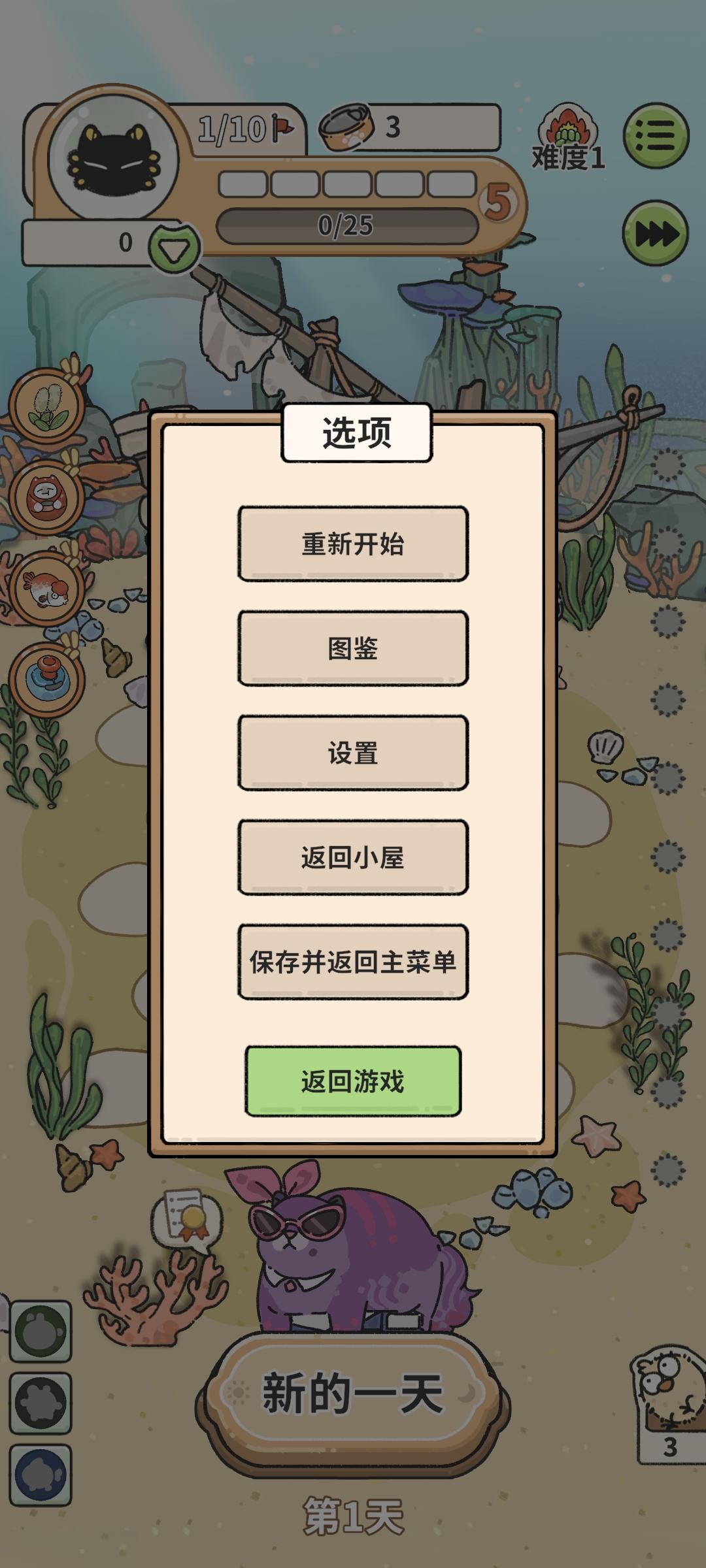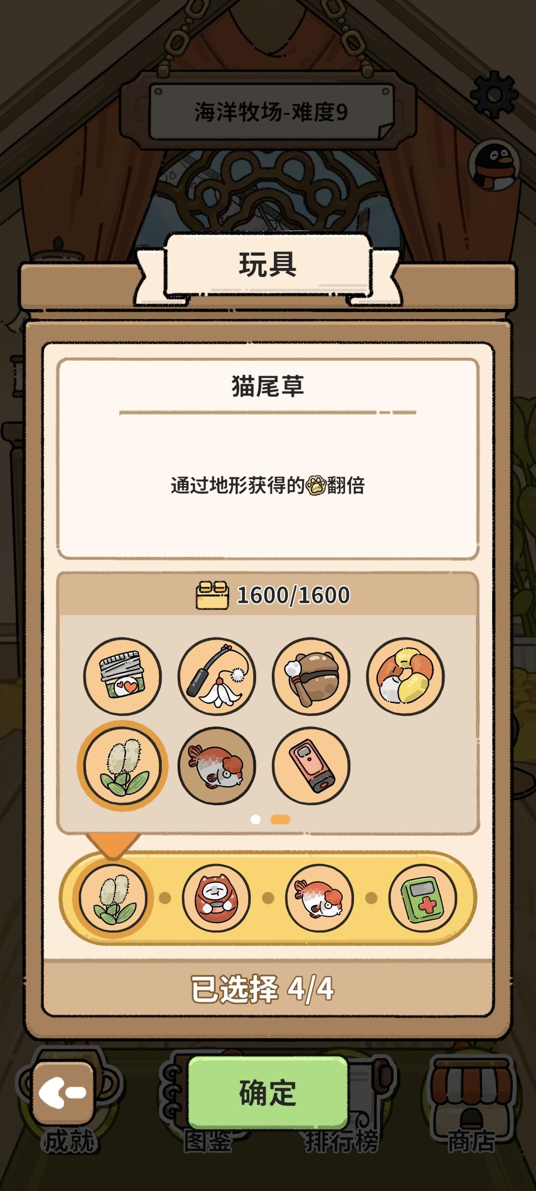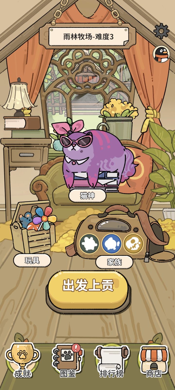 1、开局准备必备的道具,爱的小屋,一定得刷到,八级,九级后再刷,等级高出红道具几率高,刷不到就得重开,其他道具都不是很重要,加罐头的要拿,免费刷新要拿,但是刷到“爱的小屋”,其他就都不重要了首先猫神选择---小丑猫(开局换动物)玩具必选---逗猫棒(第五阶段换猫神)、木鱼(前期要除大量蚂蚁刷罐头)、剩下一个随便选,看自己觉得哪个比较好带哪个。地图选择---沙漠(开局有沙鼠)、难度2-8都可(
