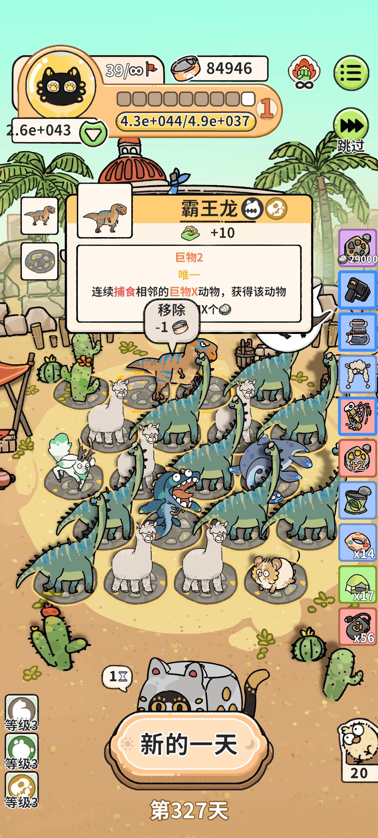 恐龙的化石机制,是一个有一定迷惑性的超简易外挂,上限高下限也不低,一切从这里开始…每阶段结束,按化石数,可以获取金币/肉罐/动物,顶格领赏(1000化石),是2000金,100肉罐,两三个红黄动物,其他档次的奖励我没印象,因为真没几次不是顶格的为啥几乎全是顶格领赏?因为有个白色动物叫小盗龙(移除时将私藏的化石*2),如果配上化石扫描器(获得化石*2),每移除一只小盗龙,接盘的小