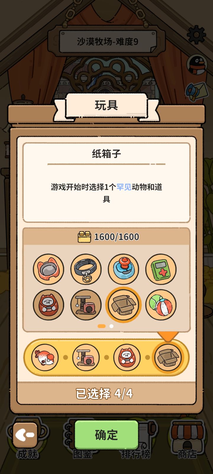 1、开局准备必备的道具,爱的小屋,一定得刷到,八级,九级后再刷,等级高出红道具几率高,刷不到就得重开,其他道具都不是很重要,加罐头的要拿,免费刷新要拿,但是刷到“爱的小屋”,其他就都不重要了首先猫神选择---小丑猫(开局换动物)玩具必选---逗猫棒(第五阶段换猫神)、木鱼(前期要除大量蚂蚁刷罐头)、剩下一个随便选,看自己觉得哪个比较好带哪个。地图选择---沙漠(开局有沙鼠)、难度2-8都可(