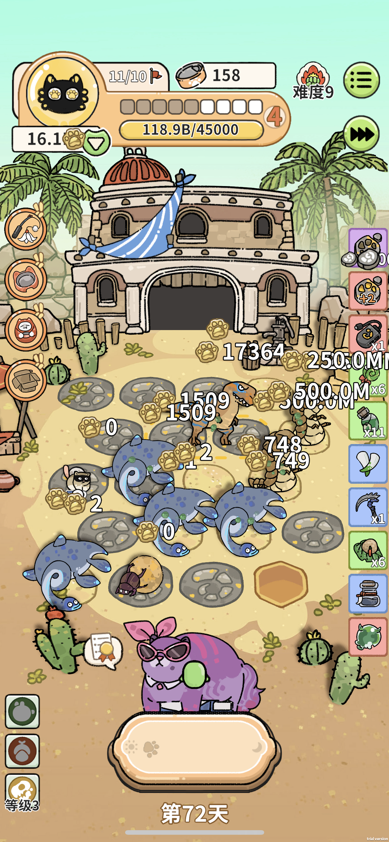 #猫神牧场攻略 #猫神牧场 #猫神牧场测试 首选龙族跟虫族,先用小盗龙过渡,获得第一桶金,化石1000奖励,如果你拿到风神翼龙恭喜你这把有了,然后疯狂拿雷龙呀这种巨物,然后开始囤道具为后期做准备,异常液体,异常糖果,毒牙,镰刀,异常宝珠,最后拿到沙漠蠕虫,直接开涨,后期补上竹节虫,要注意的是,如果有狒狒跟小偷要先把竹节虫移除再移除狒狒跟小偷,不然小偷狒狒只会越来越多!如果你拿到了第一桶化石金恭喜