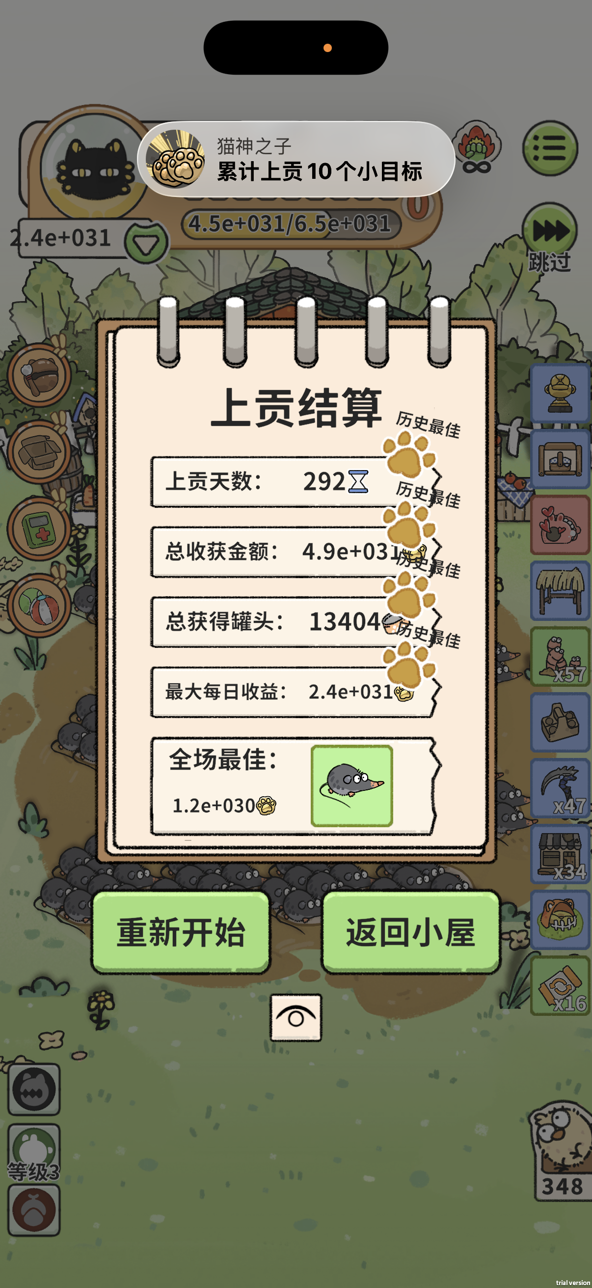 挑战刷累了,出来写攻略。#猫神牧场攻略 #猫神牧场测试 #猫神牧场 强度不多解释,30多轮一天一只动物达成上贡(e后面加的数字是位数)。一、初始配置种族选:恐龙🦖,核心是化石轮盘,前期就能罐头、上贡自由,并拿到绝迹动物和后期道具;鸟类🦜,前期过渡的恐怖鸟,完全体的孔雀,外加鸟窝;鼠鼠🐁,没有其他更好用的种族了,单纯吃杰瑞buff。玩具选:纸箱子📦(核心中的核心,套路第一轮启动必备),猫爬架