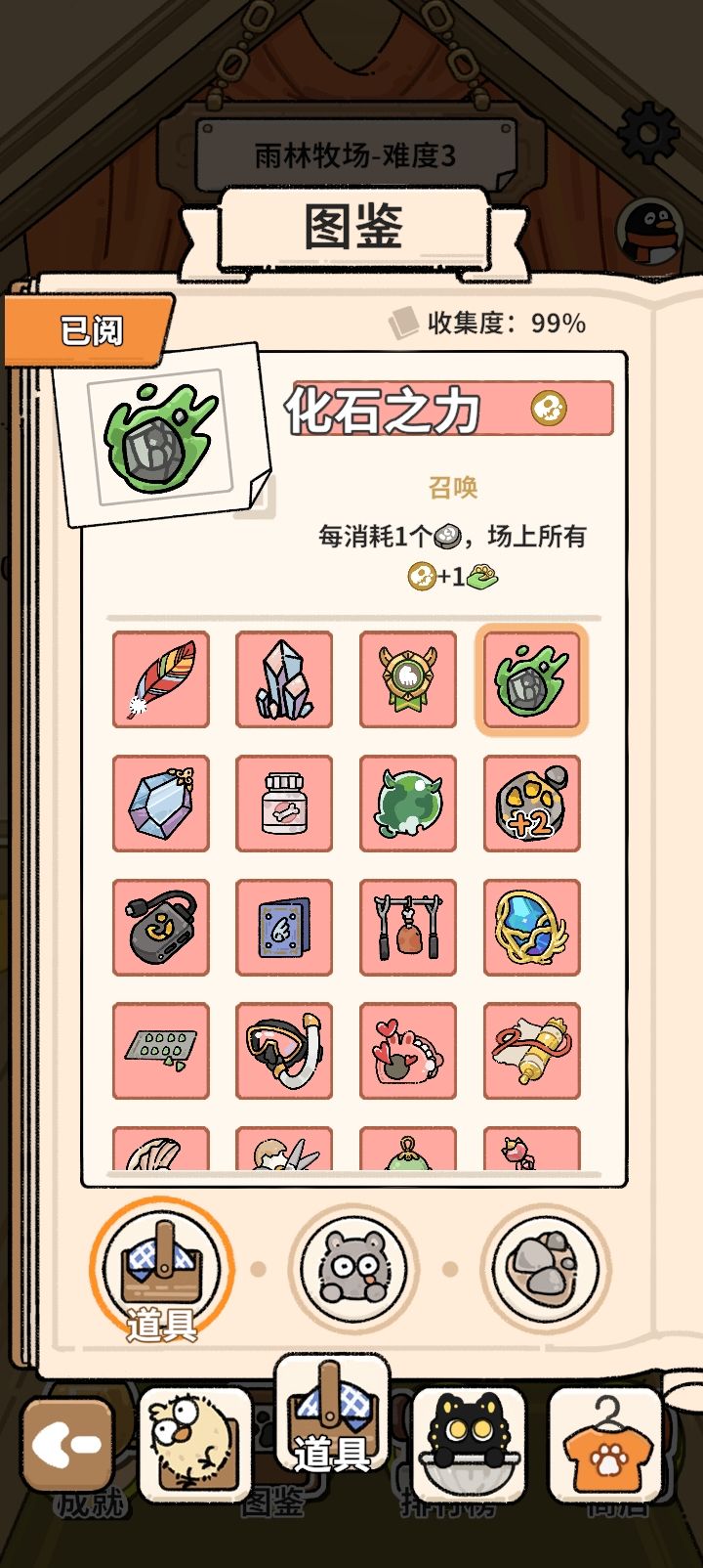 我是新手玩家,如果有说错慢慢改正首先先过图,获得纸箱子(开局选择一个蓝色动物和蓝色道具),下图开局选择喜鹊和玉米粒(每回合获得一只鸽子),然后无脑刷,把没用的动物卖了,二十个动物之后把玉米粒卖了,太多动物不行!下图刷到阶段六或者阶段七,绝迹(黄色动物)刷出率高于2%,开刷恐怖鸟,后续无限刷恐怖鸟就行。道具选择:普通:选择经济道具(彩票,信封,午餐)绿色:加固泥巴和鸟居(必须恐怖鸟之后再
