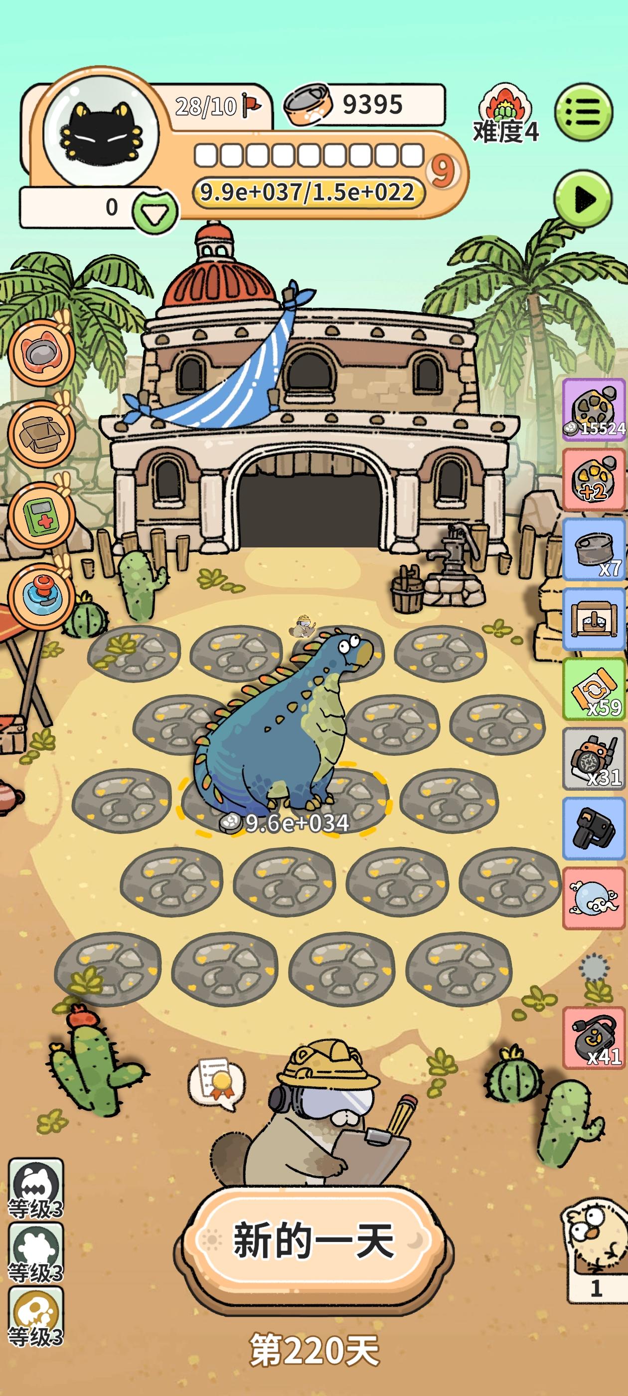 恐龙的化石机制,是一个有一定迷惑性的超简易外挂,上限高下限也不低,一切从这里开始…每阶段结束,按化石数,可以获取金币/肉罐/动物,顶格领赏(1000化石),是2000金,100肉罐,两三个红黄动物,其他档次的奖励我没印象,因为真没几次不是顶格的为啥几乎全是顶格领赏?因为有个白色动物叫小盗龙(移除时将私藏的化石*2),如果配上化石扫描器(获得化石*2),每移除一只小盗龙,接盘的小