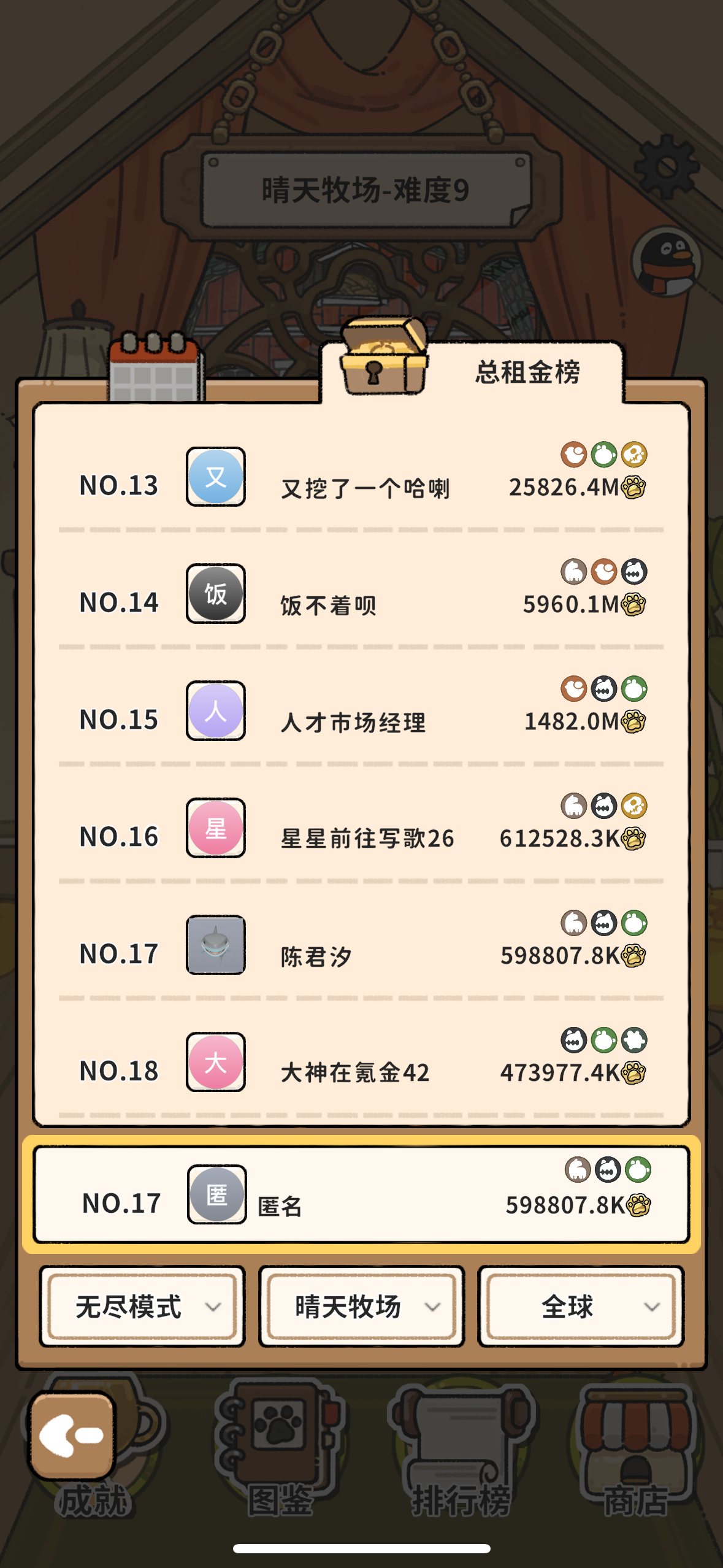 我是新手玩家,如果有说错慢慢改正首先先过图,获得纸箱子(开局选择一个蓝色动物和蓝色道具),下图开局选择喜鹊和玉米粒(每回合获得一只鸽子),然后无脑刷,把没用的动物卖了,二十个动物之后把玉米粒卖了,太多动物不行!下图刷到阶段六或者阶段七,绝迹(黄色动物)刷出率高于2%,开刷恐怖鸟,后续无限刷恐怖鸟就行。道具选择:普通:选择经济道具(彩票,信封,午餐)绿色:加固泥巴和鸟居(必须恐怖鸟之后再