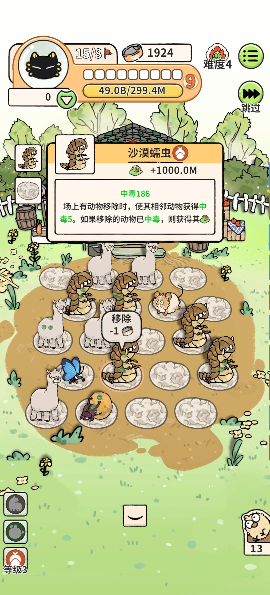 沙漠牧场(不论难度100%过) 【核心:“眼镜蛇”+道具“异常糖果”+食肉动物“湾鳄”/“剑齿虎”/“貂”/“猫头鹰”/“鹰”(这几个食肉动物随便选,最优“湾鳄”→“鹰”最差)】 开始1~4选“鼠”“兔”等繁殖快的,4开始选“食肉动物”吃鼠兔,期间可以慢慢叠“眼镜蛇”了, 同时!!!一定要先多刷商店买下“异常糖果”!!! 一定要买道具“异常糖果”!!! 之后随便玩。 期间攒“蝰蛇”。