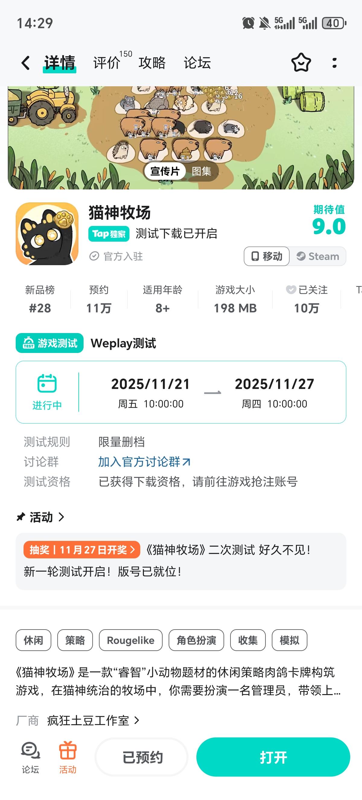 🐱大家好久不见!最近我们完成了Switch/PS/Xbox等平台的移植,并对手机版本的内容和UI等进行了新的优化,接着这次参加Weplay的机会我们又开启了一次封闭测试,同时还有好消息告诉大家,就是我们已经拿到版号拉,正式版很快就会跟大家见面!本次《猫神牧场》手机版依旧会开放部分内容供大家免费下载体验~在游戏中你可以带领各种睿智的小动物躺着给猫神大人上贡~感兴趣的宝子们千万不要错过!⏰【测试信