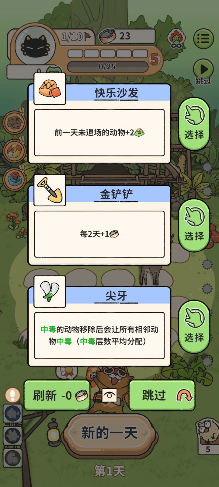 选择驯鹿和快乐沙发开局,后面藤蔓捆住苍蝇,慢慢叠利息,然后攒罐头,移除蚊子,换上搭配更好的动物