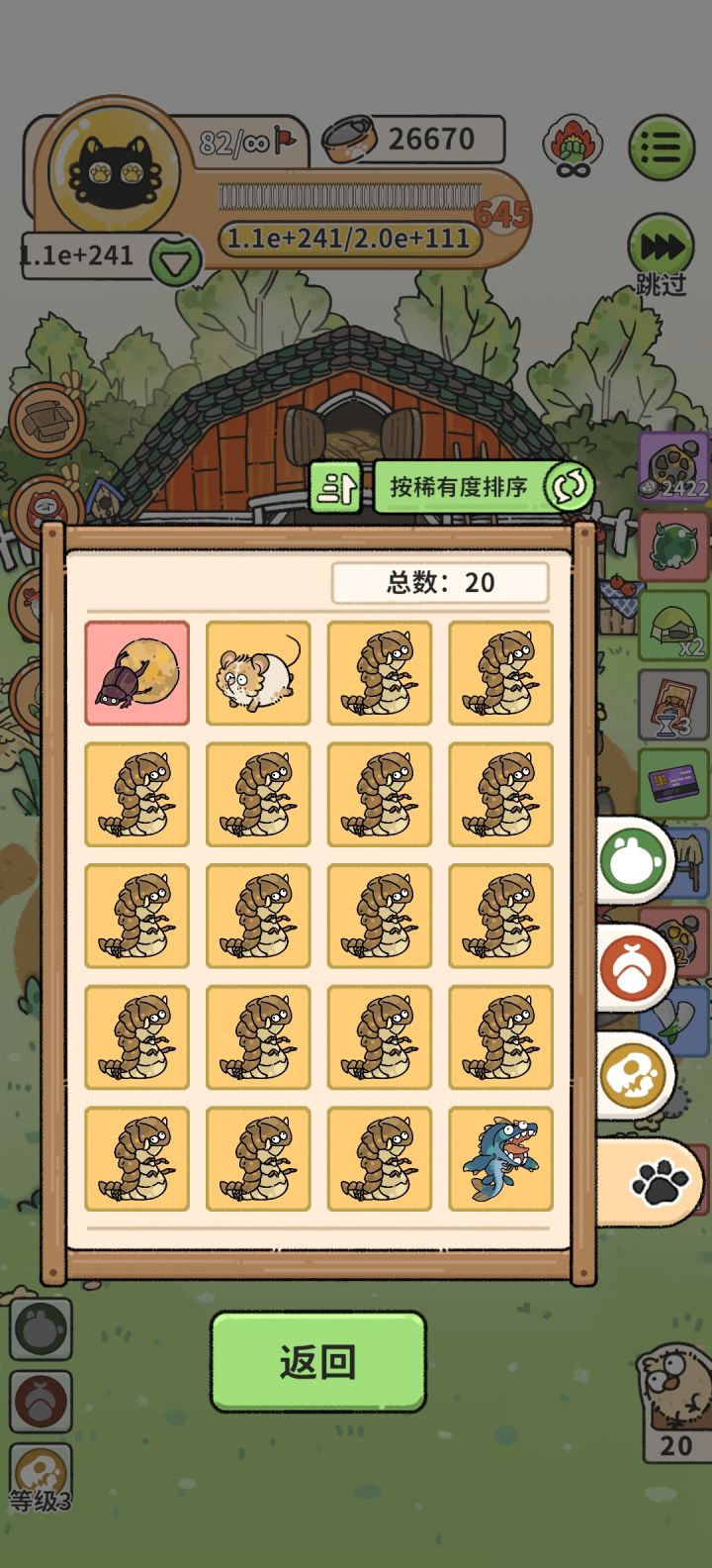 随便开了一把过了,思路是保贡献值的打法,前期地块买海水选飞鱼(不占地面不会被吃掉)过渡一下金币收入,也买水洼(水洼上捕猎加贡献值),我是给狒狒涨贡献值用的,狒狒不用移除他们会互吃,猫神技能每一轮都用掉,前四五轮可以用来移除最高贡献的动物(前期留狒狒贡献值的目的)变现罐头,一轮几十个罐头买道具比较富裕,某一轮刷到了快乐沙发选沙发,然后保着贡献打就比较随意,我前期过渡海水地块买得多懒得移除了,所以后面是用海洋动物海豚飞鱼魔鬼鱼全靠飞打完的