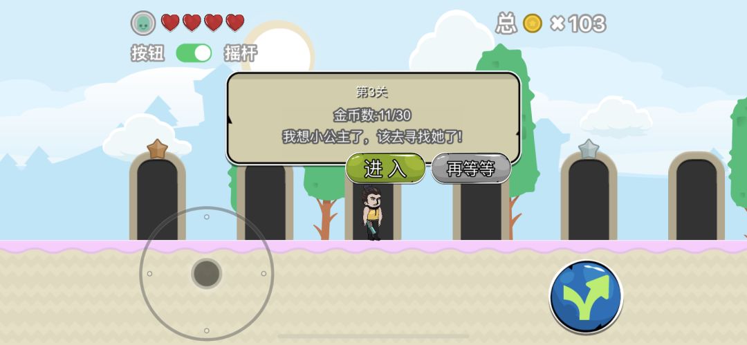 如图所示,玩家进入游戏后,需要选择进入哪个关卡,走到关卡大门处时,会显示关卡当前所获取的金币数、此关卡的总计金币数。金币有什么用呢?玩家只有通关所有关卡,救出小公主,并且收集到所有关卡的金币。小公主才会放心嫁给男主角,才能触发片尾彩蛋。加油收集吧,看看哪位大神第一个收集全部金币触发彩蛋!#攻略#游戏推荐#游戏讨论#游戏资讯#单机游戏