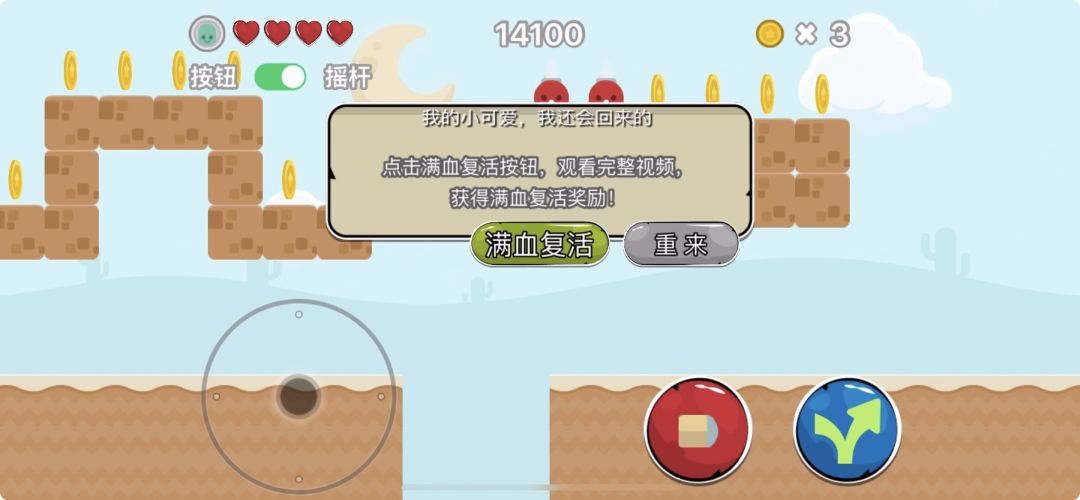 玩家在游戏过程中会因为掉落到陷阱里或者生命值减少到0,而GameOver,但大家请放心,无论GameOver多少次,游戏进度都不会丢失,也就是说,您通过到了第几关,此关卡依然保留,不会因为GameOver,而从第一关重新开始。GameOver后,此时有两种选择: 1.满血原地复活。玩家可点击图片中提示框的绿色按钮(满血复活),但需要观看20秒左右的广告 2.重玩当前关卡。玩家可以点击重来按钮,进入