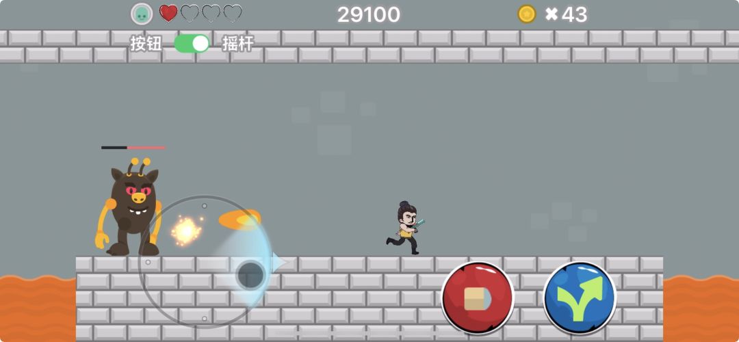 玩家方向的控制是游戏操作中最重要的,我提供了两种操作方式,一种摇杆,一种按钮。可以根据自己的喜爱随时切换。如图所示(点击红色箭头指向处切换)。