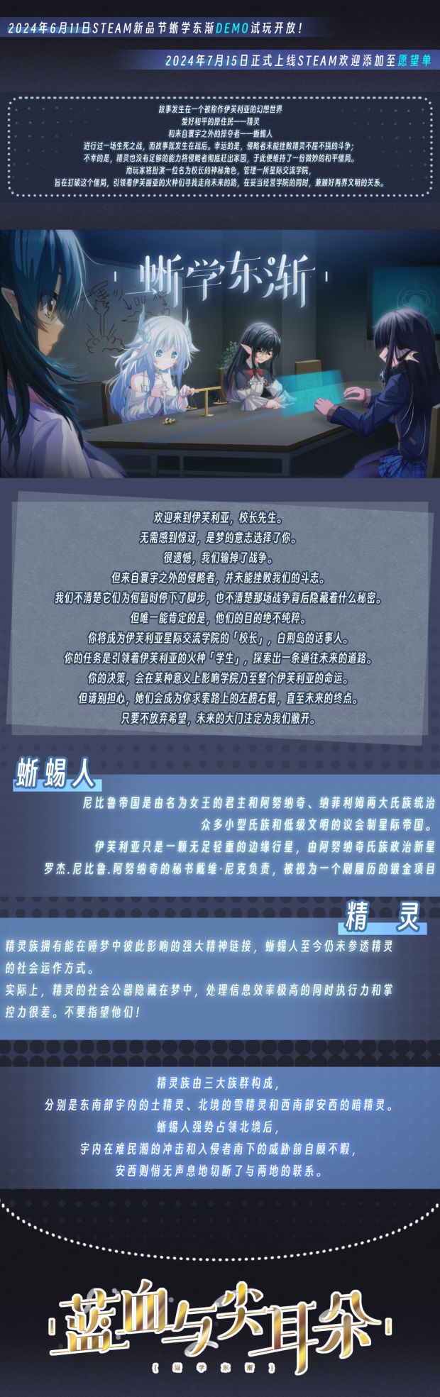 《蓝血与尖耳朵——蜥学东渐》是一款立足幻想、扎根幻想的魔幻幻想主义游戏。精灵族被太空侵略者——蜥蜴人打碎了他们原本在母星上的平静生活,被迫面对残酷的星际战争,其中诞生了无数可歌可泣的感人故事,谱写了一首壮丽的英雄史诗——在大的时间尺度上,确实是这样。但本作的时间点仅选择第一次星际战争结束后蜥蜴人与精灵“宝贵”的和平时期,从一个平平无奇的星际学校校长的视角切入,为大家带来一段暗流涌动但轻松诙谐的