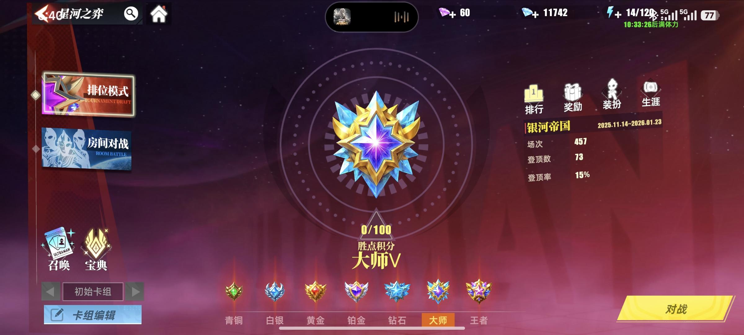 这游戏真的是拉完了。我从大师三直接掉到大师500分,我真服了。刚又打了一把。拿了个第二名,加了20分。过一天我们又打一把,今天来个第5名给我又给扣回去了。玩都玩不了。别人第8个回合就出了托雷基亚三星。,在古里姆德怎么玩就这运气量。 就这卡牌就里面靠抽卡的数值,靠运就就算了,我这直接给我连续就不能给我来个保底吗?不然王者至少还有一个机制可以来个保底,这一点都不保的。只管包输就想赢一次,一个数值难得很