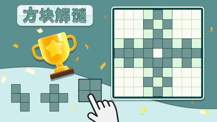 将方块拖进棋盘中,使各个不同形状的方块能够填满棋盘中的任意一个九宫格或者行列后合并消除得分。如何将更多的方块填进棋盘中是游戏的关键哦!