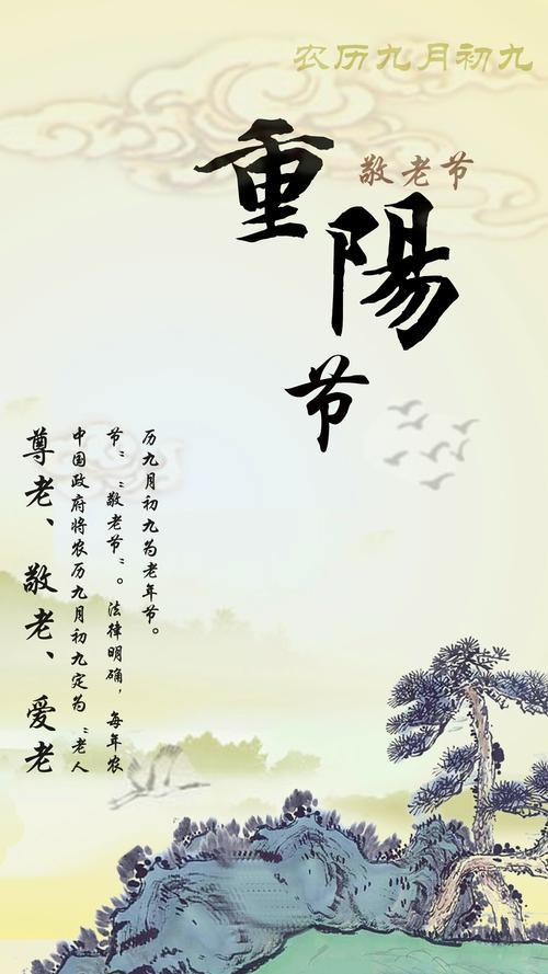 重阳节,是中国传统节日,古时民间在重阳节有登高祈福、秋游赏菊、佩插茱萸、拜神祭祖及饮宴祈寿等习俗。传承至今,又添加了敬老等内涵,于重阳之日享宴高会,感恩敬老。登高赏秋与感恩敬老是当今重阳节日活动的两大重要主题。重阳节与除夕、清明节、七月半并称中国传统四大祭祖节日。重阳节在历史发展演变中杂糅多种民俗为一体,承载了丰富的文化内涵。在民俗观念中“九”在数字中是最大数,有长久长寿的含意,寄托着人们对老