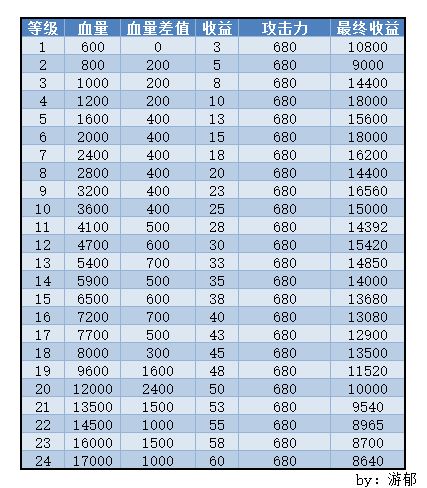 「机械帝国」活动收益表 V2.0 此贴已终结,官方背刺,可恶。 这个表我已经用论坛里面其他人发过的图来对过数据了,准确无误。总的来说,闯关并不是一定会拿的更多,主要还是得升攻击和破甲。 500攻击力以下时,4级收益最高。 满攻击力时,4级与6级收益最高。 计算公式为:3600/(血量/攻击)*收益。 血量/攻击向上取整,3600/(血量/攻击)向下取整。 本来算的时候还加上了刷新时间,但是那样反而不对了,我不知道为什么,明明刷新要一秒。