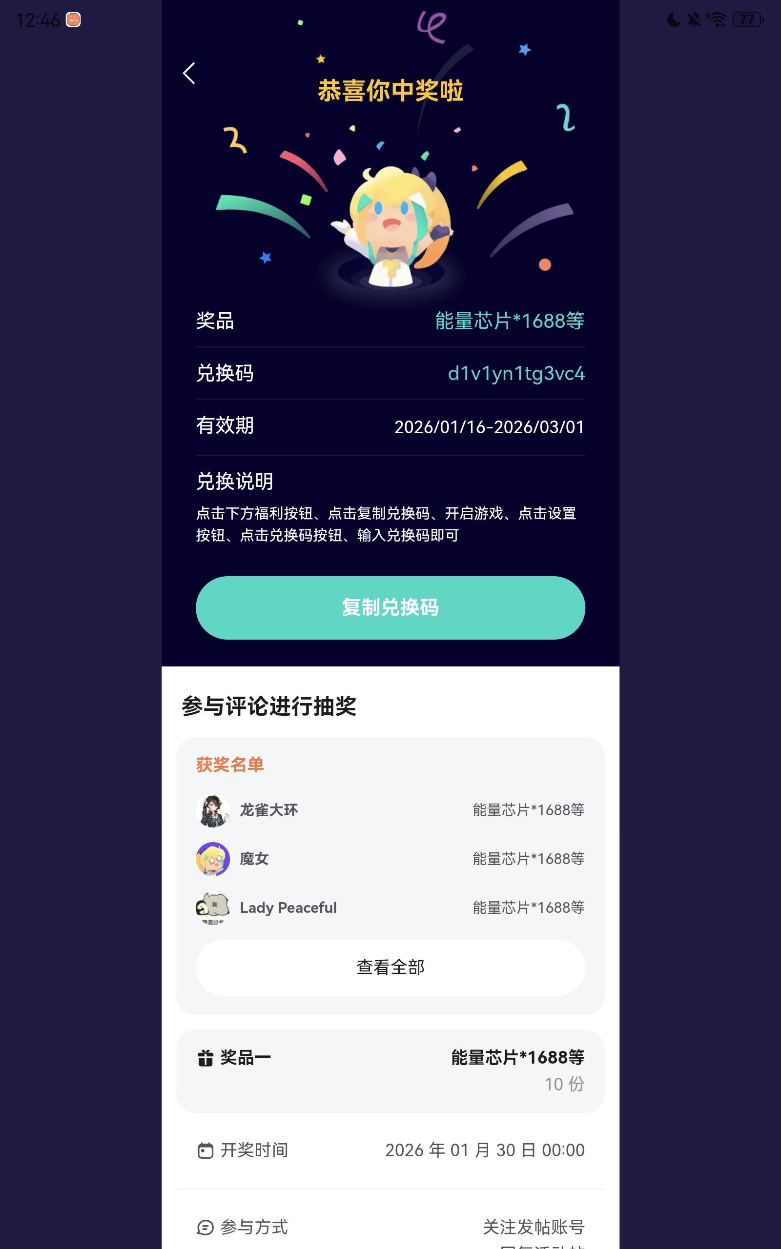 活动结束前半小时才看见,赶紧参与上了,结果中奖了