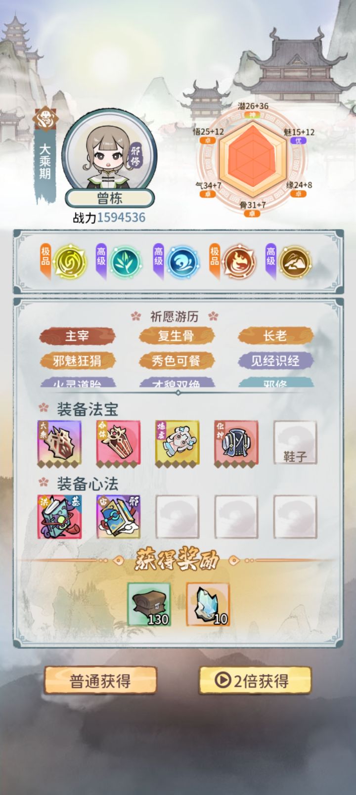 我决定给予其大师兄的荣誉名称玩到现在终于是稍微明白了,讲一下怎么玩,一直到拥有第一位渡劫弟子之前,都是新手期,新手期无脑怼潜力,潜力怎么高怎么整,尽快做出第一位渡劫弟子拥有第一位渡劫弟子之后,就解锁自动游历渡劫上限啦,这时候只需要每天重复刷渡劫弟子即可,主要是装备 心法和词条,没有渡劫装备的是弱鸡,没有宇宙级别心法的也是弱鸡,没有继承红词条的还是弱鸡后面就是无止境的日常刷弟子收菜啦