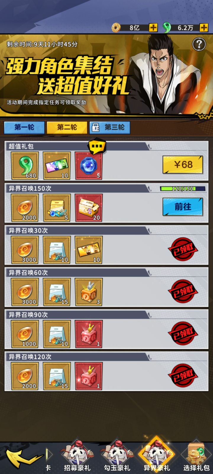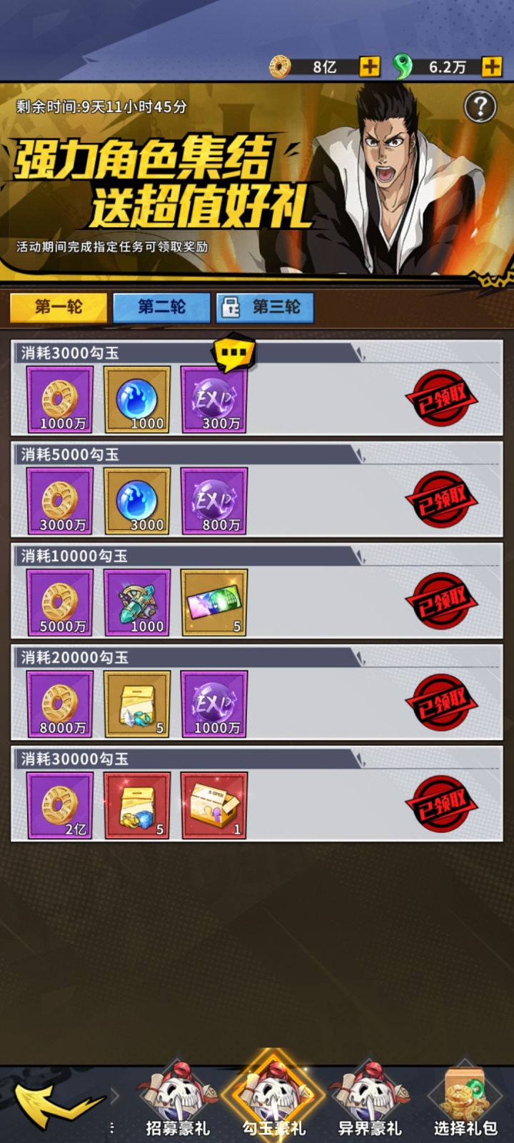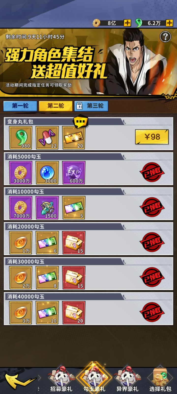 开区第二个月开启金卷活动,第一轮300,第二轮300,奖励主要是5-6星自选狗粮很划算的。 第三个月开启彩卷活动,第一轮100张,第二轮150张,勾玉消耗活动忘记什么时候开启的了,奖励也比较丰厚,高级UR碎片,145级后消耗变身丸可以置换成其他的UR,第三轮都需要V10,白嫖党就看不到了,白嫖加油,勾玉金卷彩卷别乱用