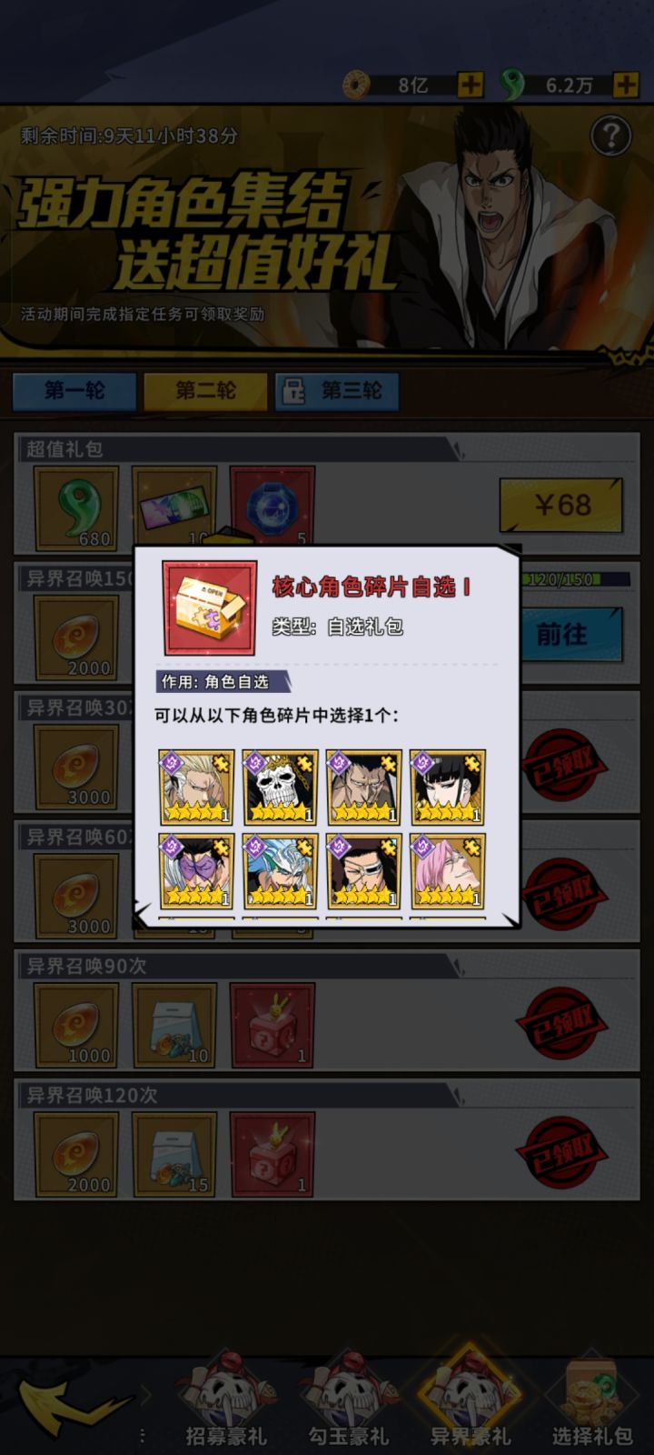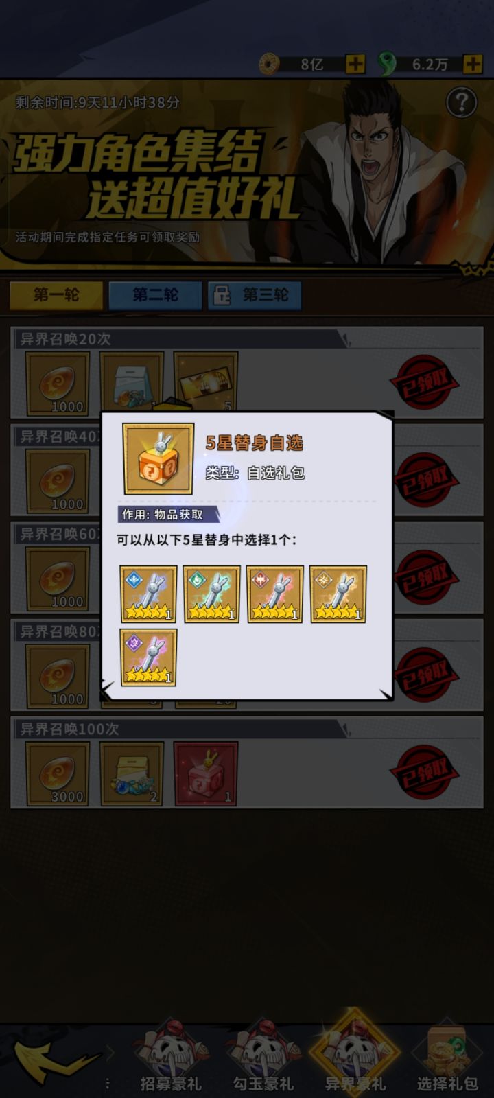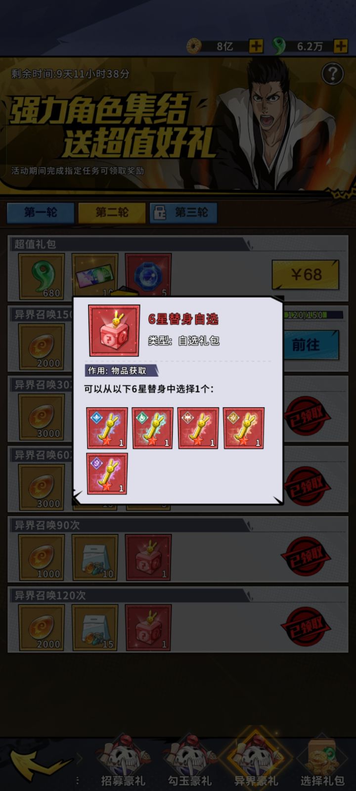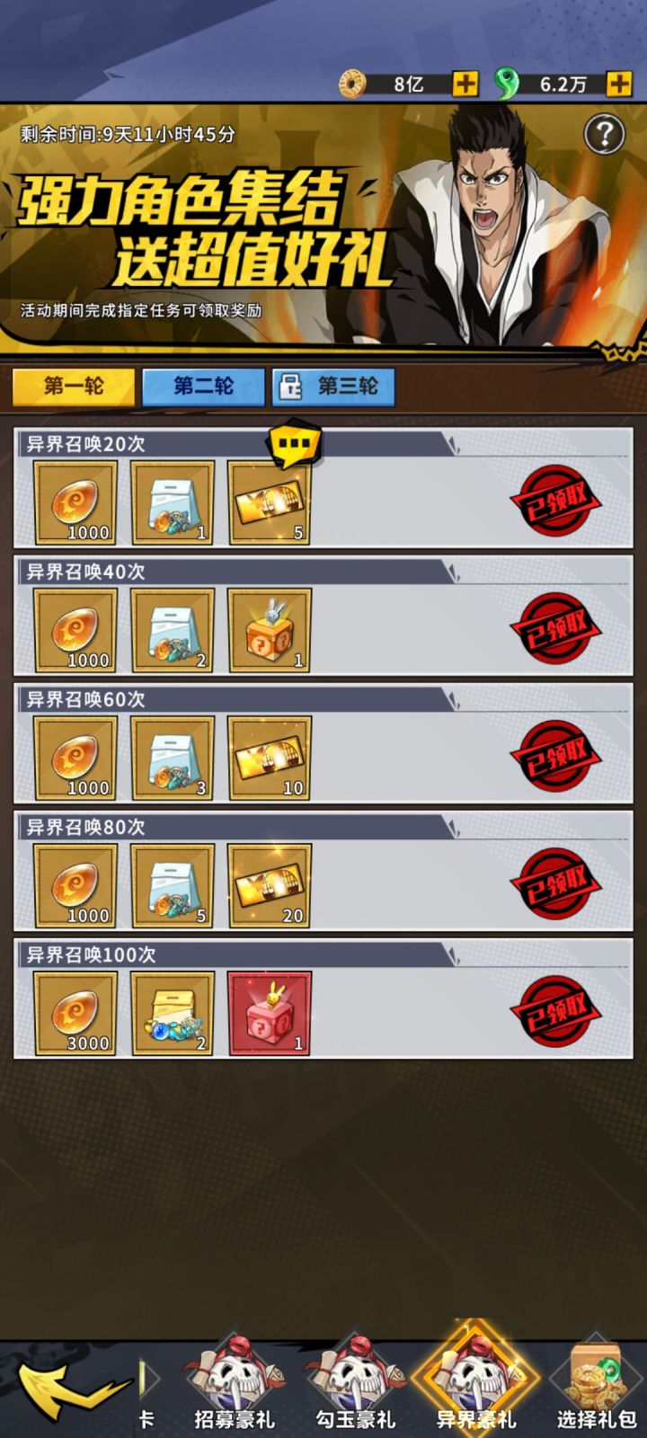 开区第二个月开启金卷活动,第一轮300,第二轮300,奖励主要是5-6星自选狗粮很划算的。 第三个月开启彩卷活动,第一轮100张,第二轮150张,勾玉消耗活动忘记什么时候开启的了,奖励也比较丰厚,高级UR碎片,145级后消耗变身丸可以置换成其他的UR,第三轮都需要V10,白嫖党就看不到了,白嫖加油,勾玉金卷彩卷别乱用