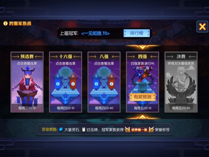 *玩法规则与家族战相同开启条件:当服务器的跨服开关开启后,该服务器的下一届家族战(20:00)即为跨服家族战 活动时间:跨服家族战预选赛:每周二20:00-20:30跨服家族战16强赛:每周三20:00-20:30跨服家族战8强赛:每周三20:30-21:00跨服家族战4强赛:每周四20:00-20:30跨服家族战冠军赛:每周四20:30-21:00 跨服家族战玩法介绍:1