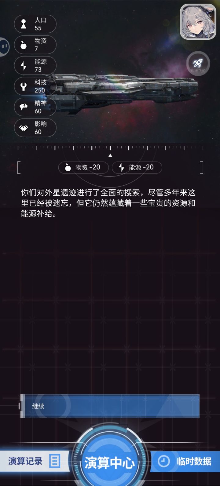 科技=武器技术,开采能源,获取食物,地方调查在保证能源足够的情况下,回合越多,海盗越厉害,在前期科技300以上,可以打海盗,在回合45以后,则不建议打海盗容易暴毙。能回应信号就回应信号,最多就是海盗设局,耗费10能源即可逃跑,但大多数为物资和能源,少数为科学家的科技或者和工厂进行交易。在能源或物资低于20,可以去抢普通的飞船。在精神低于50且无法回正不要去颁布消耗精神的法令。开局先颁布能