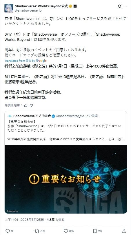 📅影之诗日服宣布停运,运营十年经典卡牌游戏落幕 没想到啊家人们,由日本Cygames公司开发的“知名”卡牌游戏《影之诗》近日引发玩家讨论。官方于3月25日正式发布公告,宣布日服将于2026年7月1日上午十点停止服务,这款自2016年6月上线的经典卡牌游戏自此被放弃,画上属于自己的句号 考虑到同为Cygames公司开发的《神击的巴哈姆特》在停止更新后的命运,初代《影之诗》大概是被放弃了。不过