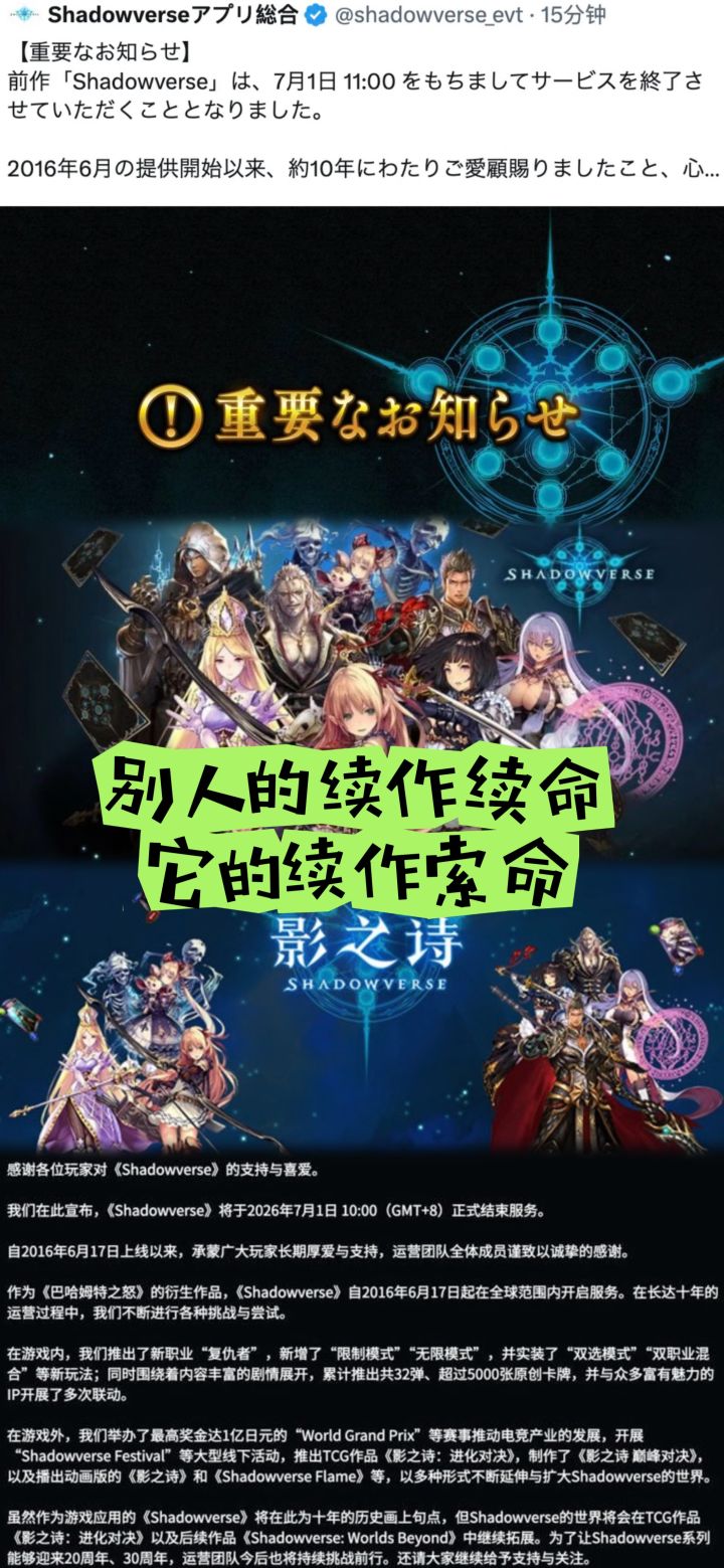 #今天游戏圈发生了啥 #资讯评论员 #影之诗 #影之诗超凡世界 3月25日,日本游戏公司Cygames正式发布公告,宣布旗下运营近十年的经典卡牌对战游戏 《影之诗》 将于7月1日上午正式停止服务,这款自2016年问世以来,凭借精美二次元立绘、豪华声优阵容及独特进化机制风靡全球,被誉为日本炉石的现象级作品,在即将迎来十周年纪念之际,选择将该作未来托付给其正统续作 《影之诗:超凡世界》,为初代作品辉