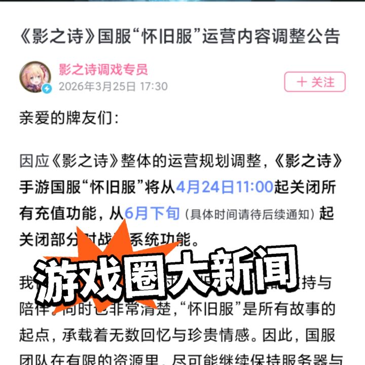 🃏影之诗关服,国服关闭充值保留对战与剧情,让回忆继续陪伴家人们来吃瓜了,由日本Cygames公司开发卡牌游戏《影之诗》近日因关服公告引发玩家讨论。近日,网易国服代理方发布公告,国服作为怀旧服,将在未来做出改动。改动为4月24日中午起关闭充值功能,6月下旬起关闭部分对战及系统功能,但自由对战、联机对战、剧情模式及解谜挑战等核心内容将继续保留。 官方表示,怀旧服承载着无数回忆,因此会在有限资