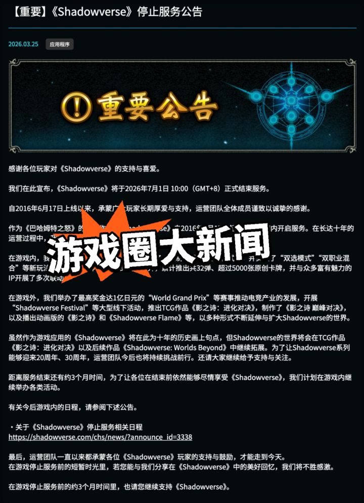 逆天!运营近十年的经典卡牌游戏《影之诗》,在昨天3月25日正式官宣将于7月1日上午10点停服,消息一出直接冲上热搜,引起热议 这款游戏2016年上线,陪伴玩家走过了近十年时光,推出过五千多张卡牌,还有多种玩法模式和热门IP联动,是很多人心中的卡牌神作。 而游戏停服补偿福利也公布了,由于游戏已经停止出售水晶,已买的水晶还能正常使用,官方给所有玩家免费开放高级通行证,后续还会有几次卡池重置和