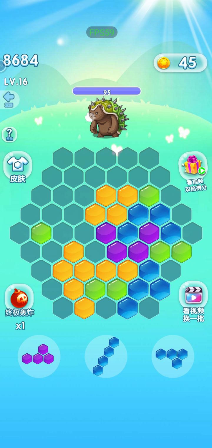 在消除游戏的基础上,增加了打怪。每消除一行的积点就是对怪物进行伤害的点数。每打败几个小怪以后会出个大BOSS。但是打完怪物没有奖励,可以设置为每消灭一个小怪就随机消除一个,每消灭一个大怪就消除5个。不然这些怪物没有意义,看都不需要看一眼,就专心棋盘消除好了。优先放形状大的,再放小的。