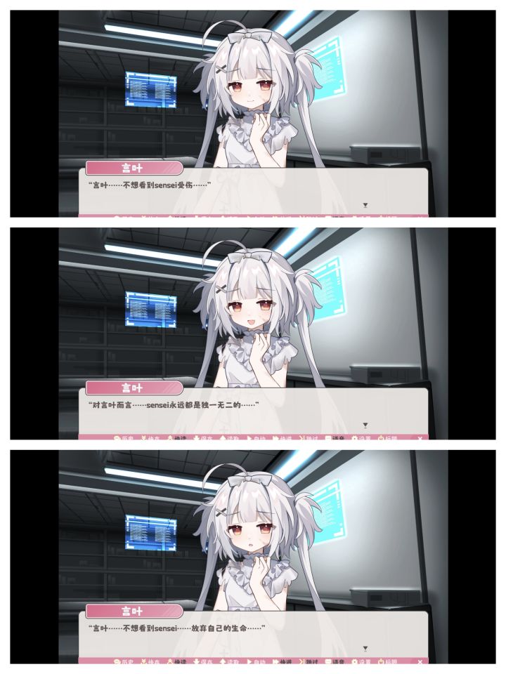 游戏的一开始是和言叶的日常,“我”在其中扮演类似言叶的监护人的角色,负责照顾言叶,陪言叶一起玩耍、学习。这一段真的很治愈,很温馨,音乐也很柔和~