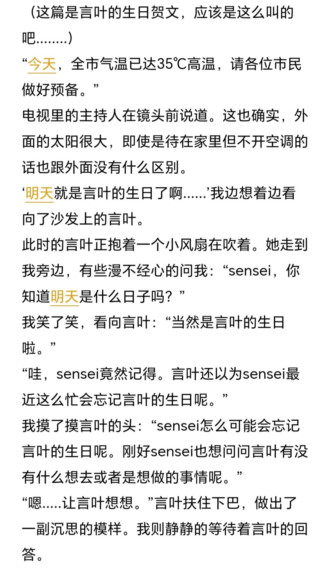 一大早,言叶就兴冲冲地地把自己和小忆做完的习题册全都拿了出来,在我暂时用作办公的书桌上整整齐齐排列开。 (言叶)“待会sensei看到了,肯定会很高兴吧!” 小忆打着哈欠走出房间,睡意未消。 (小忆)“言叶也有进步嘛,比之前聪明了不少呢。” (小忆)“已经可以和吾做同一个难度了~” (言叶)“那当然…唔,不对!小忆你明明是在夸自己好吧!” (小忆)“谁让言叶总是笨笨的。” (言叶)“你说谁笨!” 言