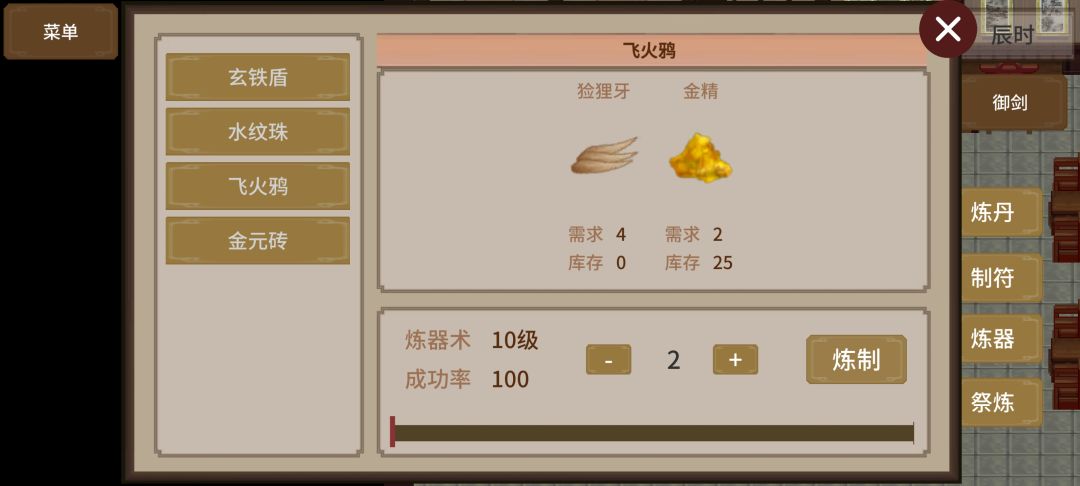 前期买水纹珠和飞火鸦的材料,把炼器术刷到10级。刷到10级,炼器术圆满后,可以一份材料炼两份😛 之后买玄铁盾材料(20灵石)和水纹珠材料(26灵石) 一份材料可以炼成两份飞火鸦(32灵石)#飞剑在渊 😛