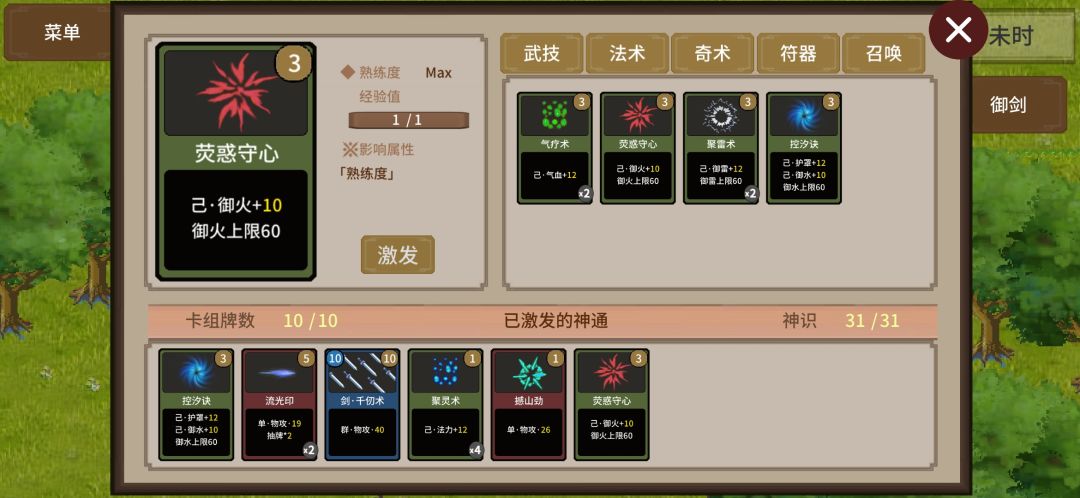 祭练法宝2次,太乙丹吃满,学流光印,聚灵术满级,巨剑高等级。留一张过牌启动,最好是低伤流光,聚灵术+千仞=高上限。也可以花灵石玩符提高过牌减少留牌量。掌雷和正气太拖游戏节奏,这应该是最快的方法。