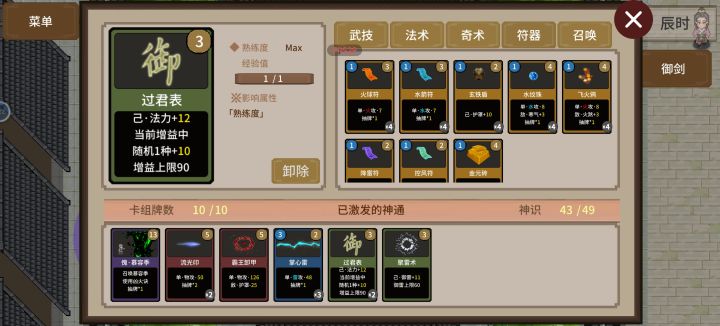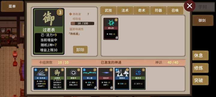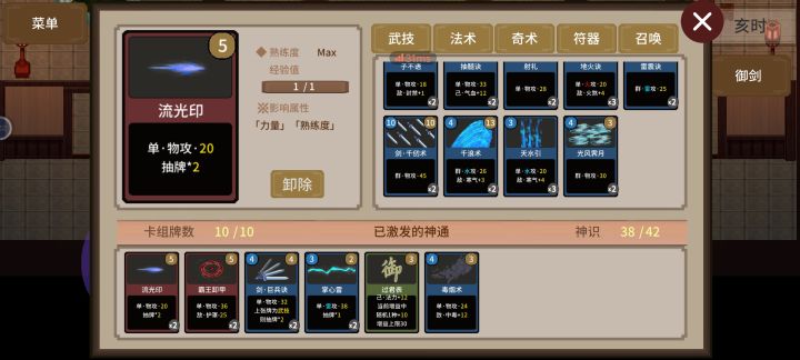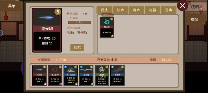 开局炼丹炼器赚灵石,赚钱的时候顺便把太宵宗好感刷了把掌心雷学了,钱够五千左右去商店学流光印然后把灵气上线的丹药吃满五颗就行了卡组带两个流光印,两个掌心雷,两个巨剑术,一个奇书回蓝,五个拳头(体术都可以触发巨剑术的抽卡效果流光印是体术)练气期这套卡组除了500血的猴子和两只拧兽打不过其他随便打。