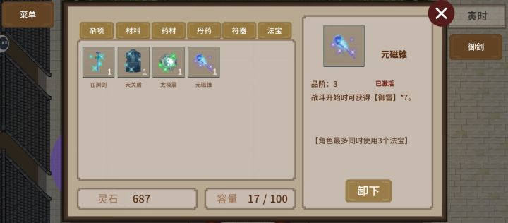 ,下一步实在不知道该怎么做了,唯一的就是升级法宝,那个资源有点难刷,一天只能买50个,我用的是那个剑,还有一个盾,还有一个反甲的,挺喜欢这个内容的游戏的,因为感觉灵石是有作用的,不是一串数字,基本上什么