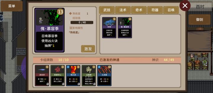 因为主线功法不能用,剑法不能叠加剑意,所以要转修法术。然后慕容季是火系法术得学御火,要打两次,第1次用火系神通。慕容季的大招是减血量上限,特别恶心。第2次剑法功发可以激活,但要学到5级以上。这样每次使用卡牌都能叠加5点,因为第2次的慕容季有很恶心的技能。血量为零的时候自动满血。所以得趁他放技能的时候消灭1000滴血,然后再连续消灭1000滴血。否则他第2轮又会重新放复活技能,等自己的血量上限一