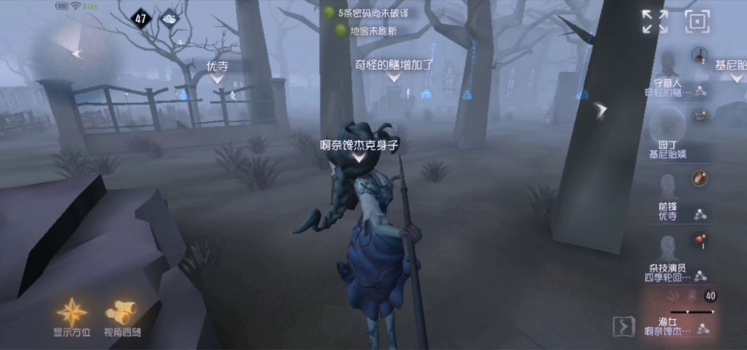 我发现许多新手玩家不会溜渔女,所以用守墓人溜个渔女…遛渔女主要讲究转点,注意水汽,并适当拉开距离,这样渔女基本拿不到双刀。如果她直接收叉准备直接出刀,就使用技能(使用时机因技能而异,例:医生在挨刀后再用技能)这一局把守墓人玩成了先知…秒“鸟”后遗症( ー̀εー́ )。顺便补充一下,在渔女手下救人时也要时刻注意水汽,避免还没救就倒地了的情况,但如果是地下室…就可以卖了(゚ω゚)