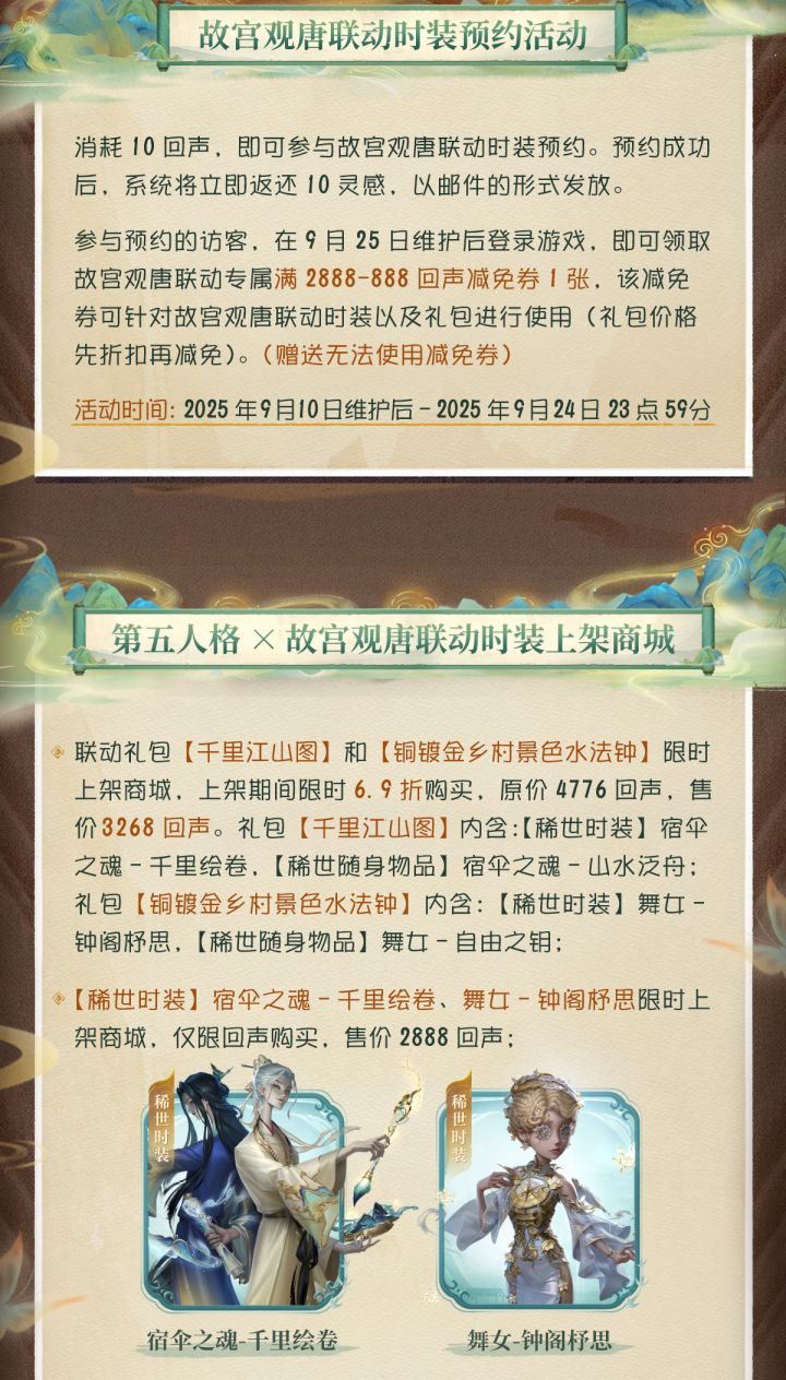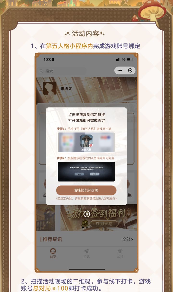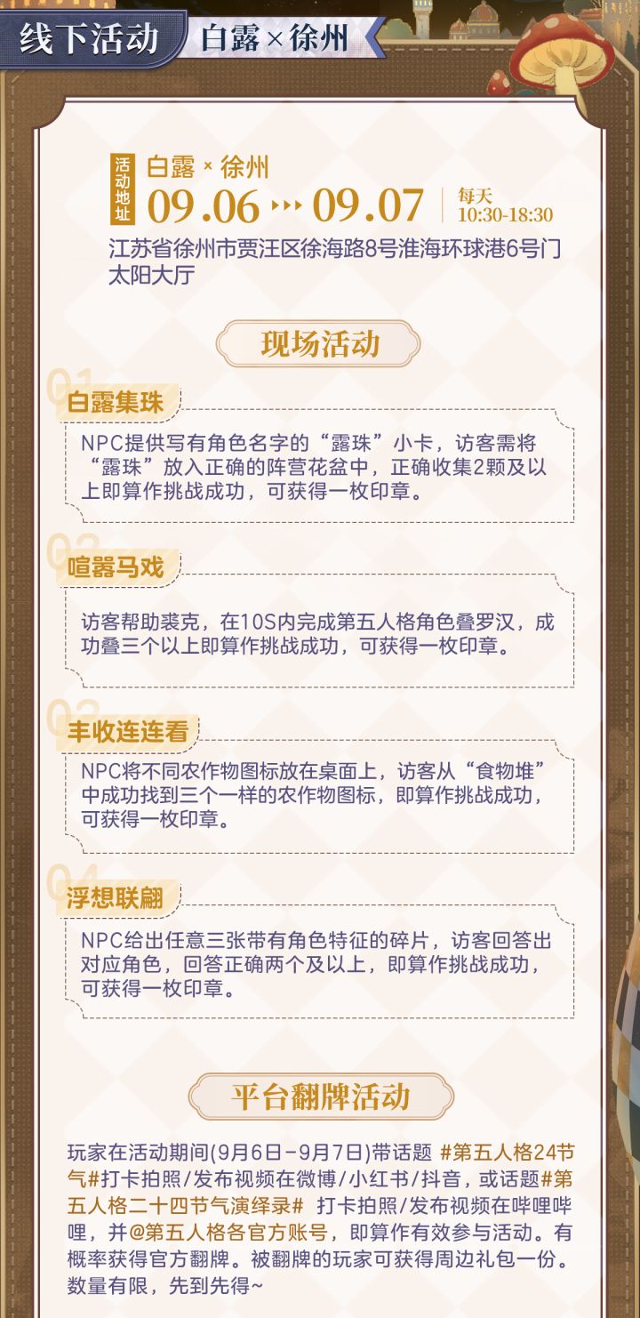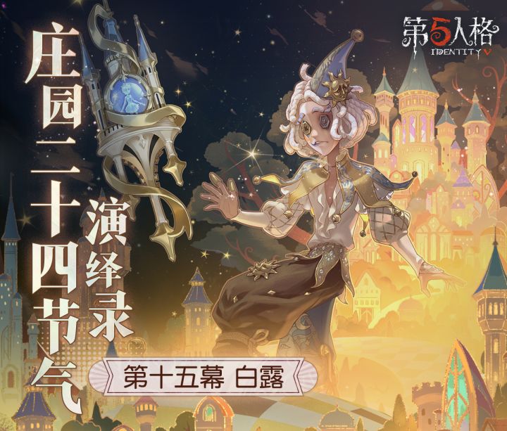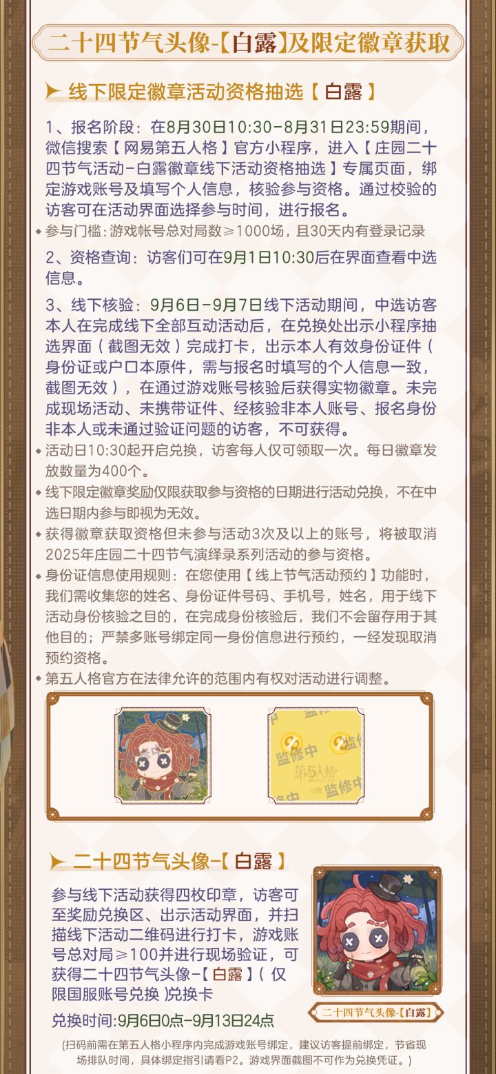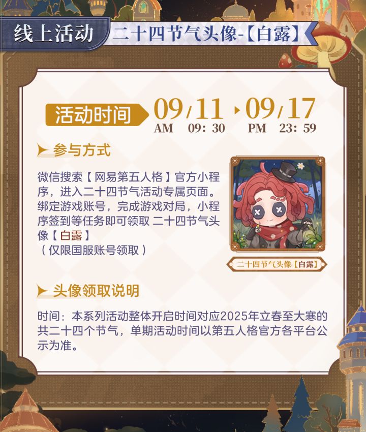 二、线上活动:二十四节气头像-【白露】活动时间:9月11日10:30-9月17日23:59参与方式:微信搜索【网易第五人格】官方小程序,进入二十四节气活动专属页面。绑定游戏账号,完成游戏对局、小程序签到等任务即可领取二十四节气头像【白露】(仅限国服账号领取)。详情请于活动开始后查看小程序活动细则。