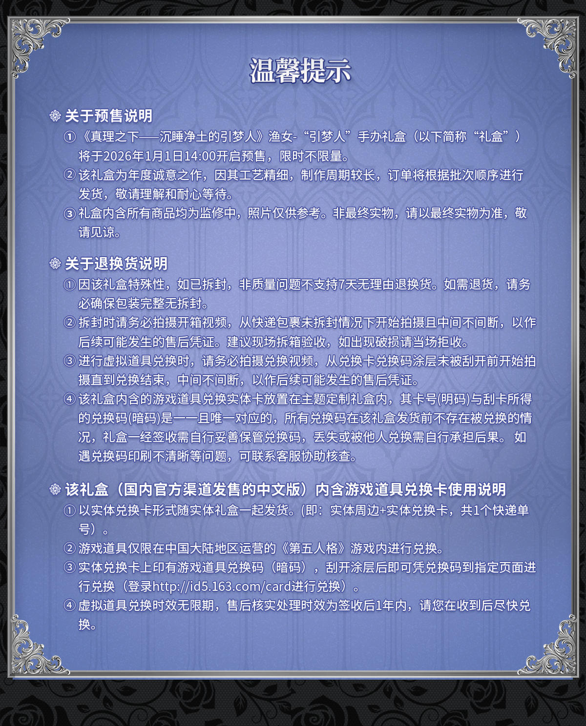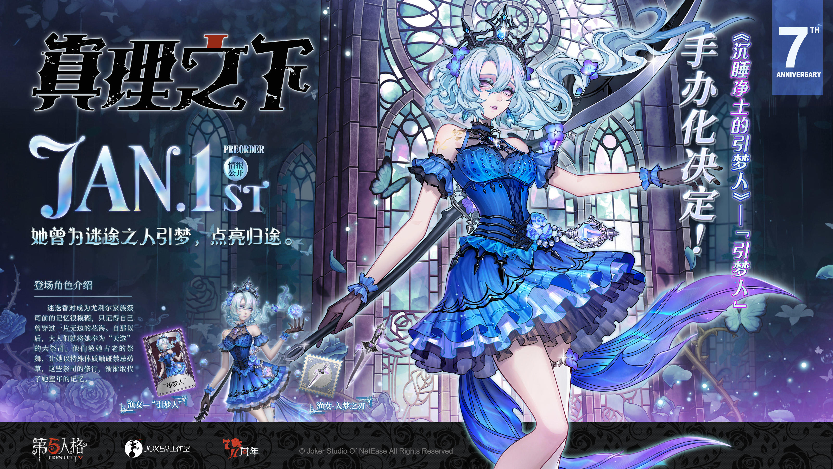 《真理之下——沉睡净土的引梦人》渔女-“引梦人”手办礼盒销售情报公开!※【重点】游戏内商城直接获取方式:【礼包】(含时装+随身物品)限时8折:1316回声【奇珍时装】渔女-“引梦人”:1388回声【随身物品】渔女-入梦之刃:258回声游戏内商城上架时间:2026年12月30日-2027年1月30日 手办礼盒销售信息:预定渠道:游戏内嵌商城-玩偶之家、第五人格天猫官方旗舰店、大神APP