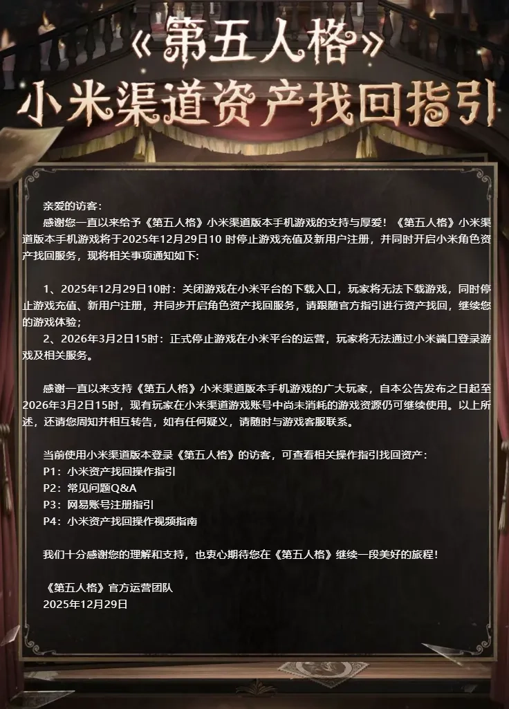 亲爱的访客: 感谢您一直以来给予《第五人格》小米渠道版本手机游戏的支持与厚爱!《第五人格》小米渠道版本手机游戏将于2025年12月29日10 时停止游戏充值及新用户注册,并同时开启小米角色资产找回服务,现将相关事项通知如下: 1、2025年12月29日10时:关闭游戏在小米平台的下载入口,玩家将无法下载游戏,同时停止游戏充值、新用户注册,并同步开启角色资产找回服务,请跟随官方指引进行资产找回,