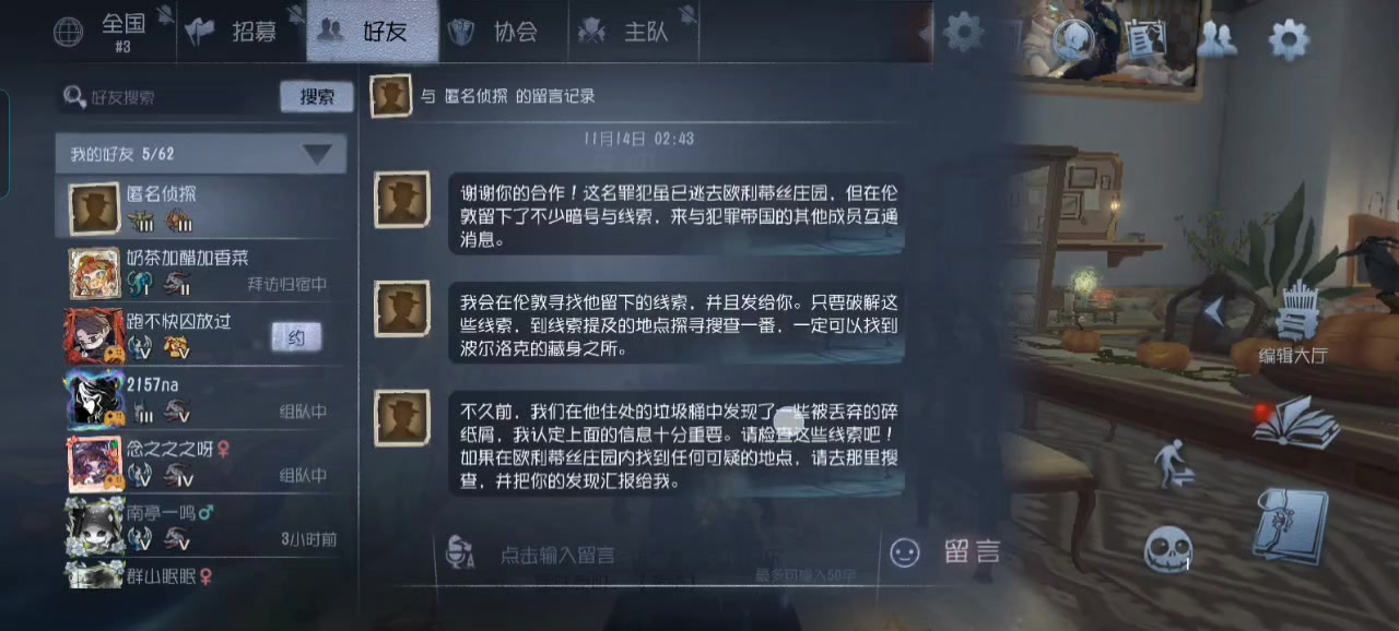 刚开始邮箱收到一封信,我没当回事,每次一键领取删除还在也没当回事。今天依旧一键,突然后知后觉觉得这封信有点特别,点开一看,任务?然后就有了好友栏里的对话!难度不是很大,不过最后那张图是什么鬼?[表情_惊恐]数学老师,我突然有点想你[表情_捂脸哭]#第五人格