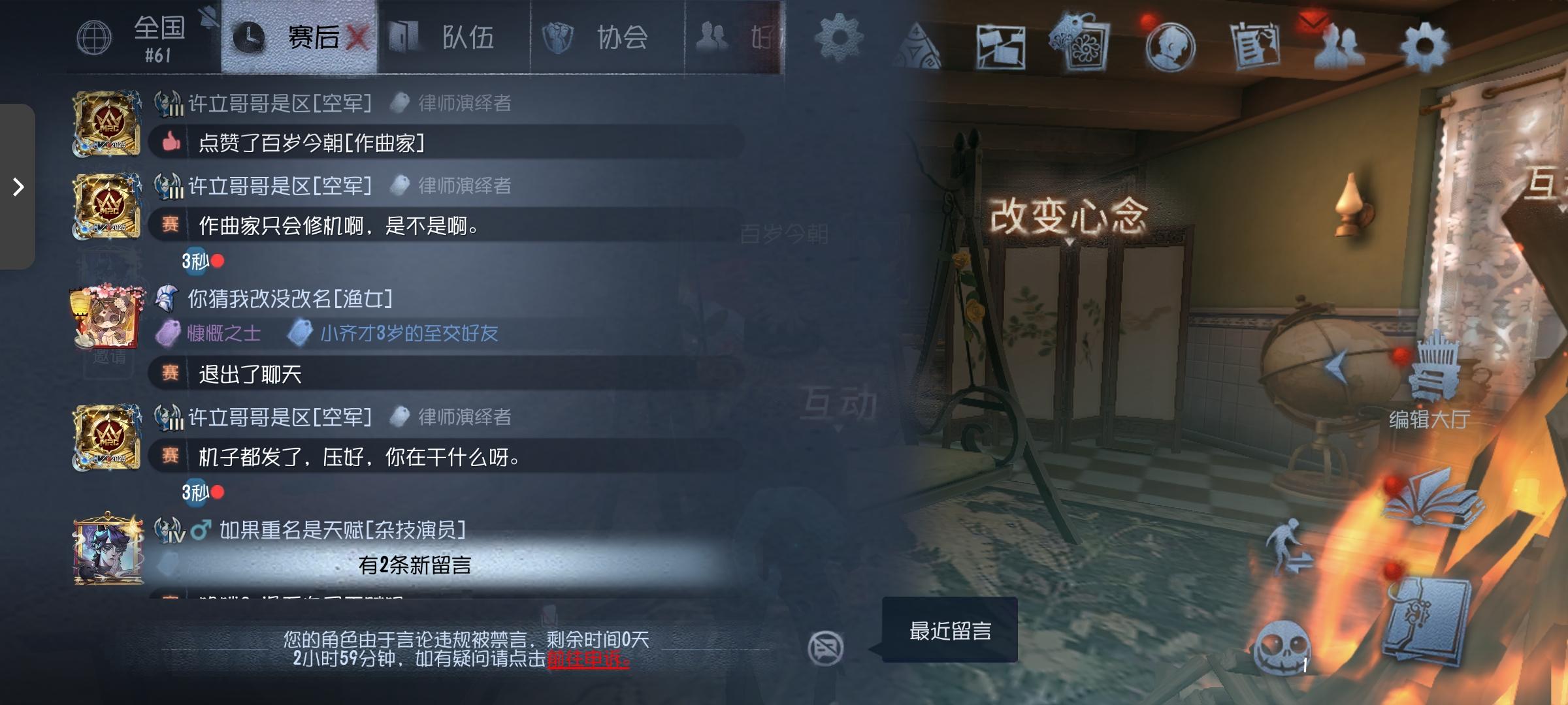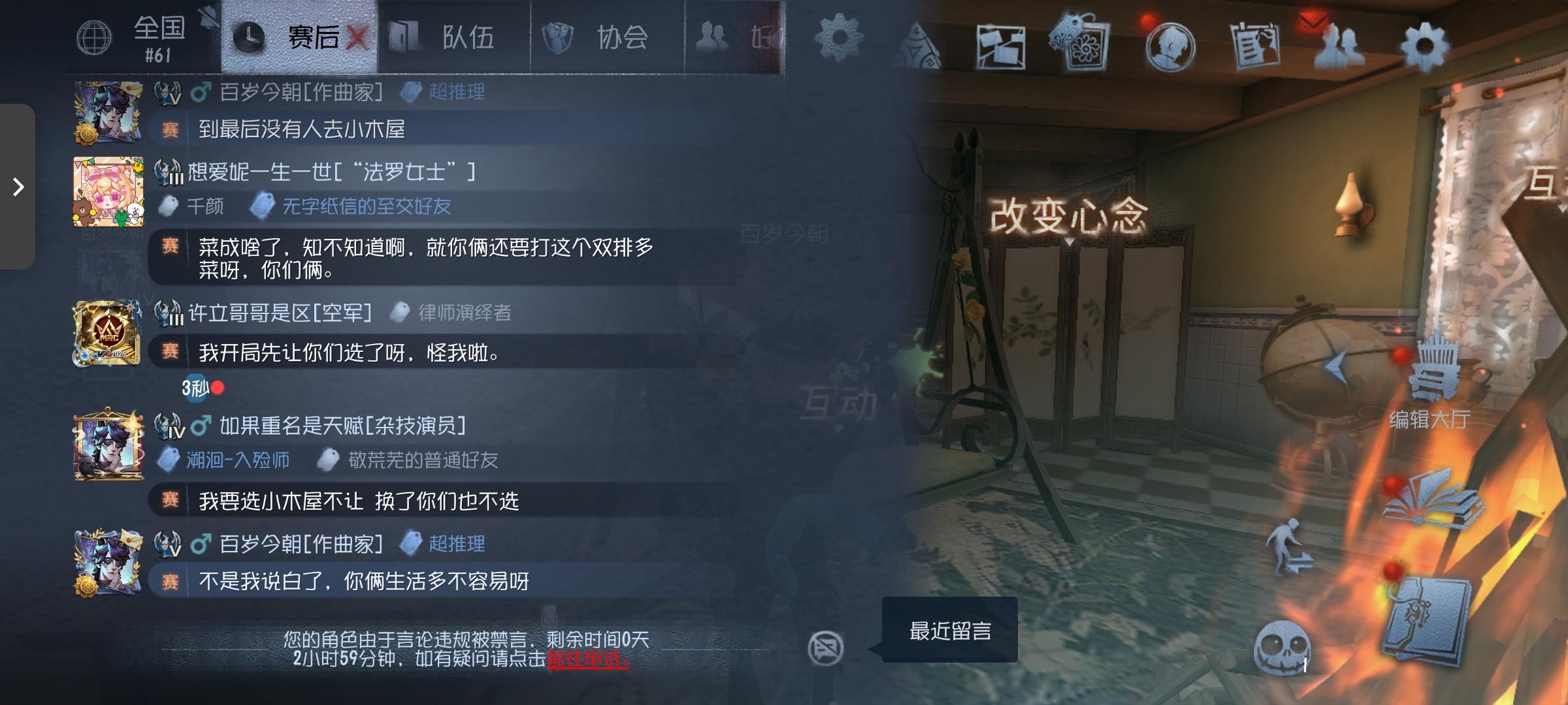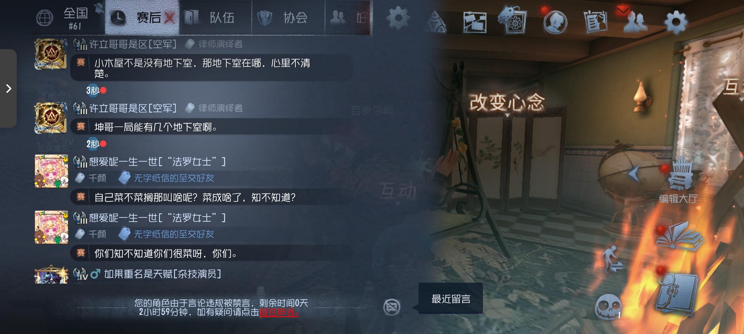 第五,我说白了,你家里都少点啥的,举报审核你一点也不看对吗?发两句何意味不骂不说啥的,直接就胡乱禁言,想怎样,对面追着骂都不禁言,发何意味不骂对面都禁言,法罗没带大心脏不发天赋,我也不知道他这个双排队友是想咋的,上来直接赛后我们来,说不过就举报,本来能平局,咱也不知道这空军是哪根筋犯错了,非要去掏法罗,我和我另外一个朋友也是双排,说我和我朋友有信息差,当时我在被追,我也发信号了。反倒是法罗一直不发