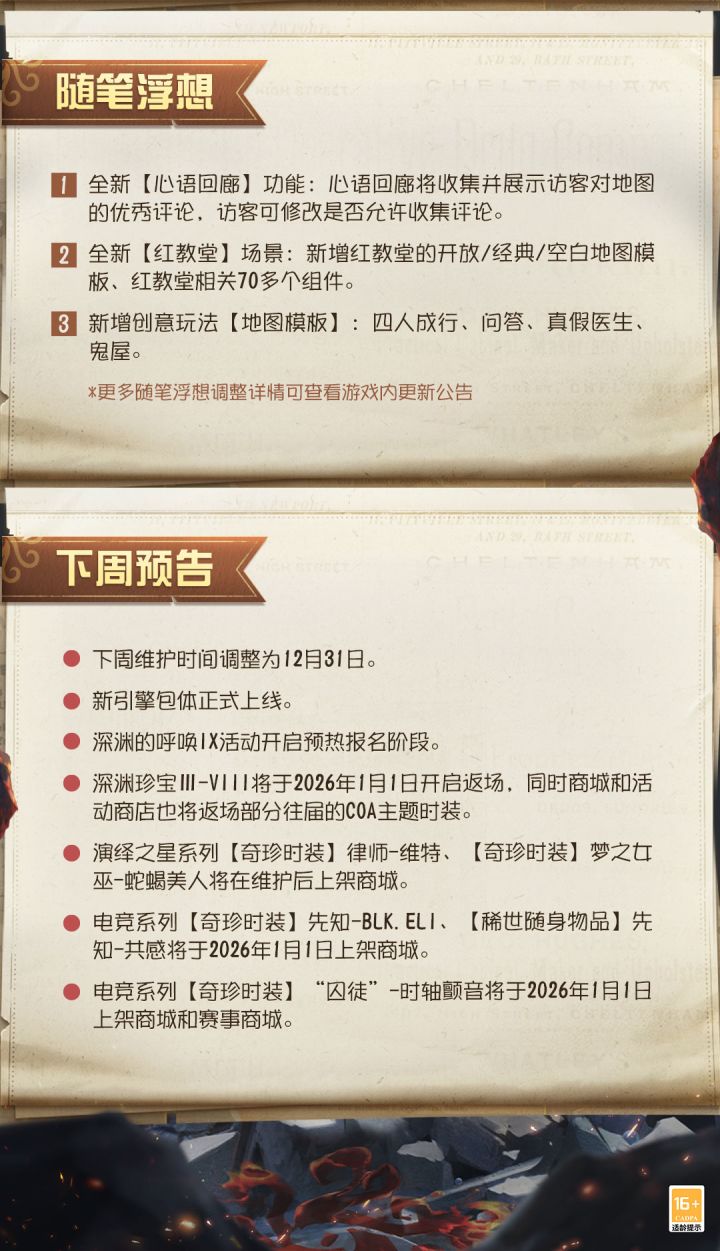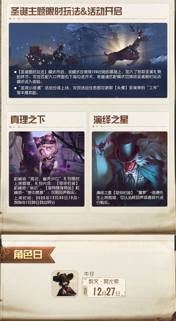 2025年12月25日维护公告划重点版本送达!元旦活动 “奇想烟花铺”上线, 圣诞限时玩法模式开启~ *机械师“再见,幽灵少女”礼包上架时间:2025年12月30日10点 - 2026年1月30日23点59分#第五人格维护公告